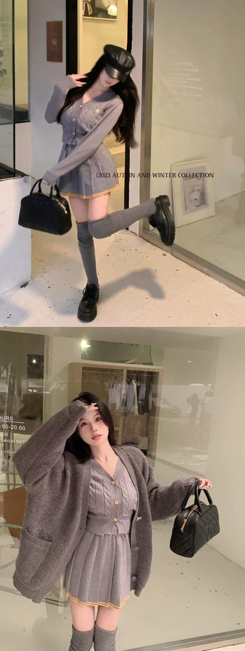 色:グレーのカーディガン,グレートップ,グレースカート,アプリコットカーディガン,アプリコットトップ,アプリコットスカート