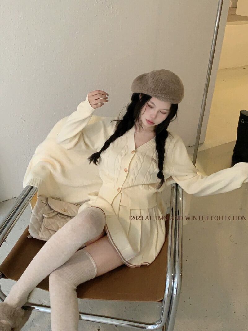 スタイル純粋な欲望 V ネックツイスト長袖セータープリーツスカート女性秋 2023 新しいファッションスーツ ロング オータム 秋物 Vネック ピュア missk48737940136