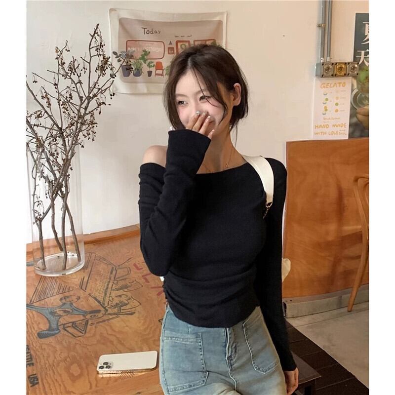 ホットセクシーなオフショルダー気質セーター初秋 2023 新しいスリムスリム長袖ボトシャツトップス女性 ロング オータム 秋物 missk47468311559
