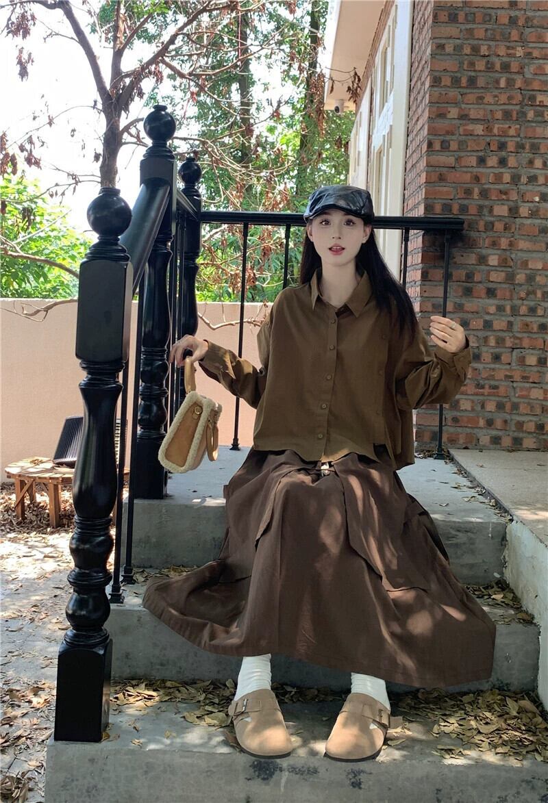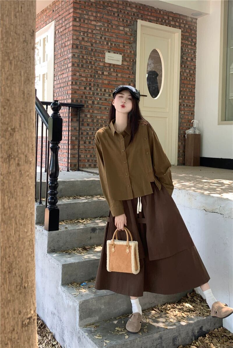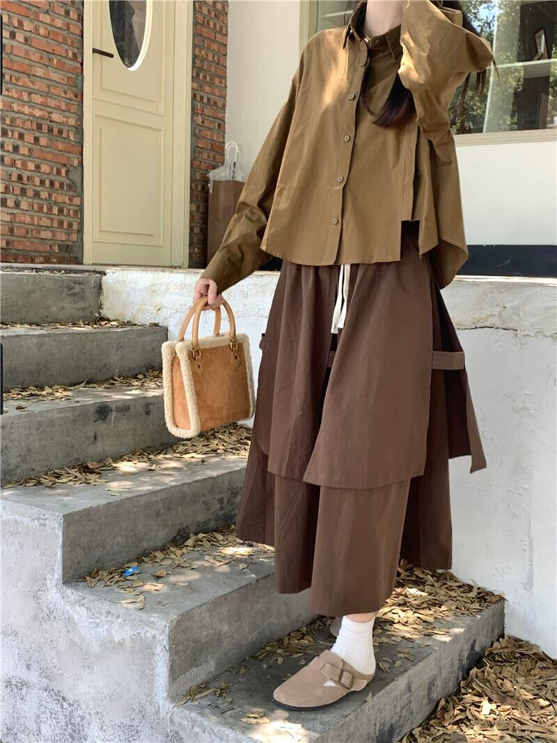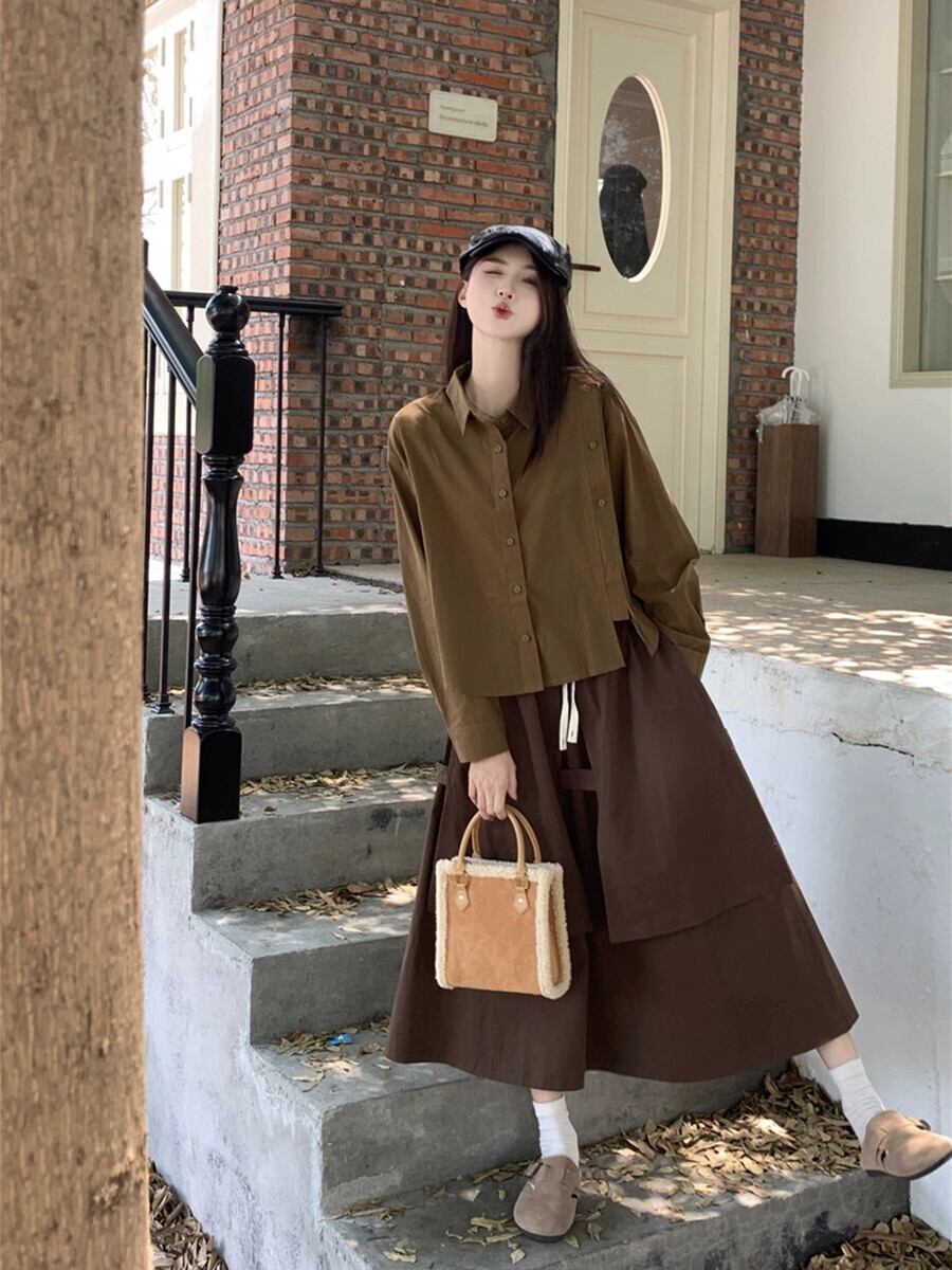 色:アプリコットシャツ,コーヒーシャツ,カーキ色のスカート,コーヒー色のスカート