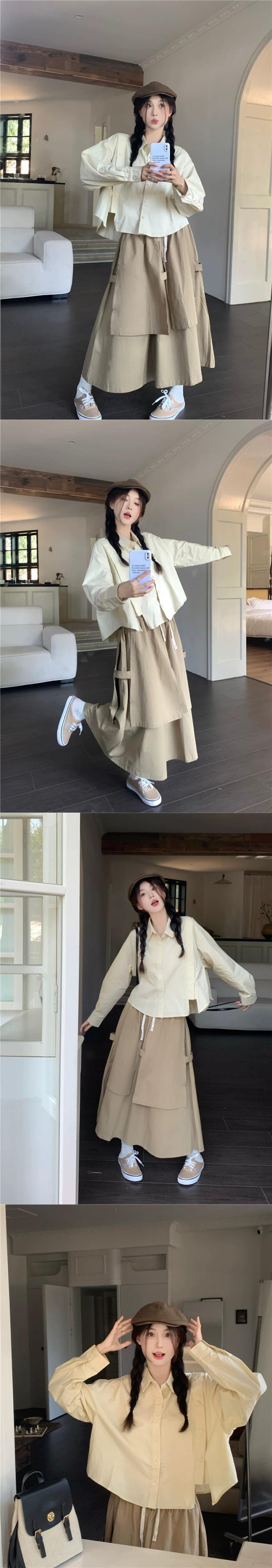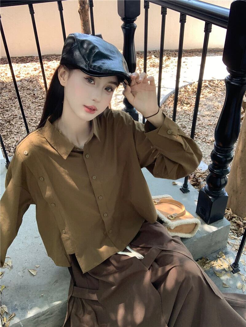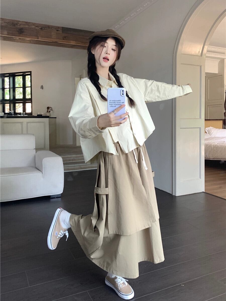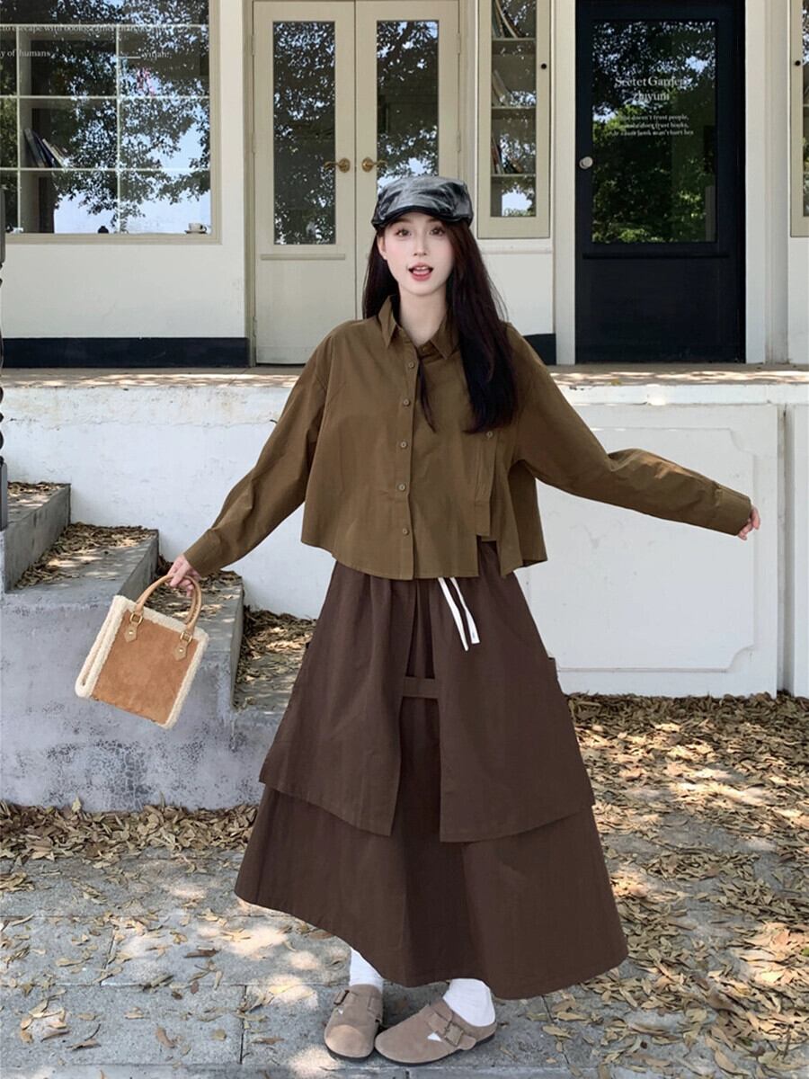 色:アプリコットシャツ,コーヒーシャツ,カーキ色のスカート,コーヒー色のスカート