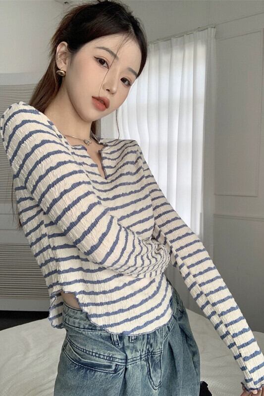 真菌エッジ V ネックストライプ Tシャツ女性夏バージョン 2023 新しい純粋な欲望痩身スリムショート長袖ボトシャツ ロング サマー 夏物 Vネック ピュア missk72070941402