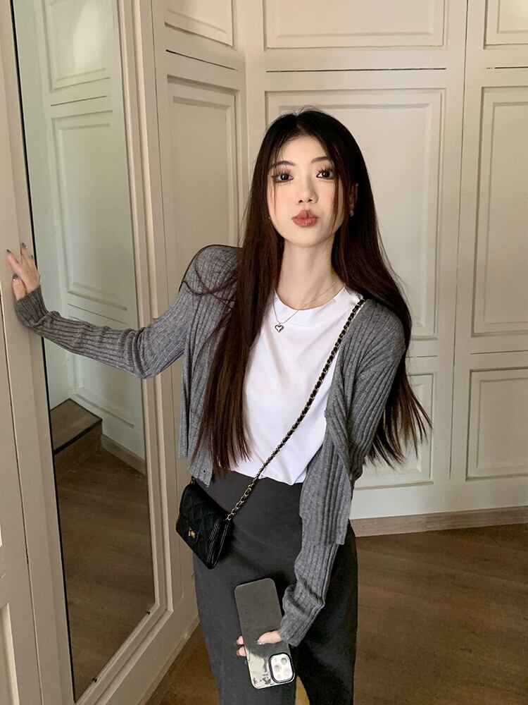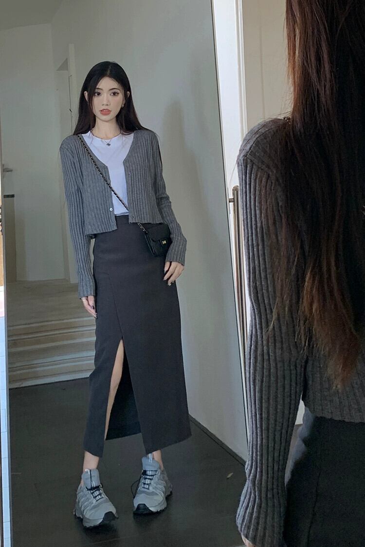 色:気質グレーのカーディガンセーター,白い綿のTシャツ,グレーのスカート