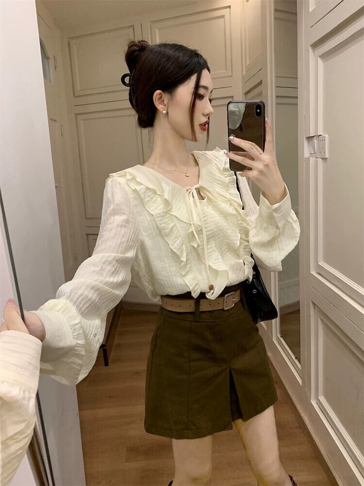 レトロVネックベスト、フリル長袖シャツ、スカート、レディース2023秋新作、年齢軽減2点セット ロング オータム 秋物 missk29476598793