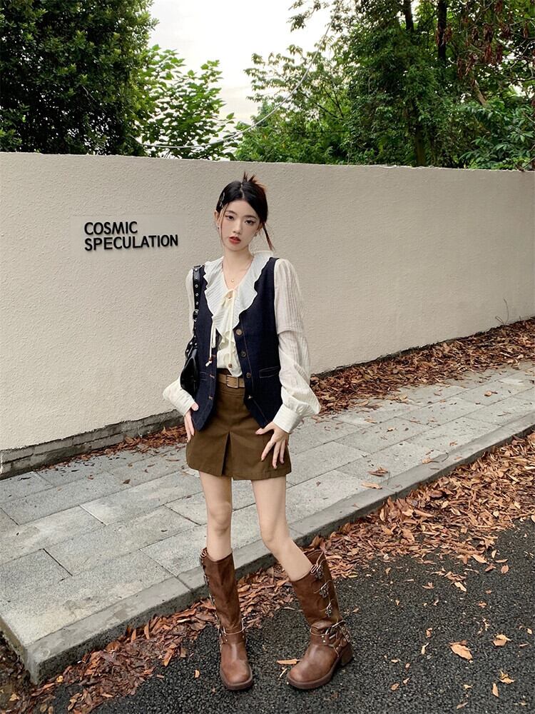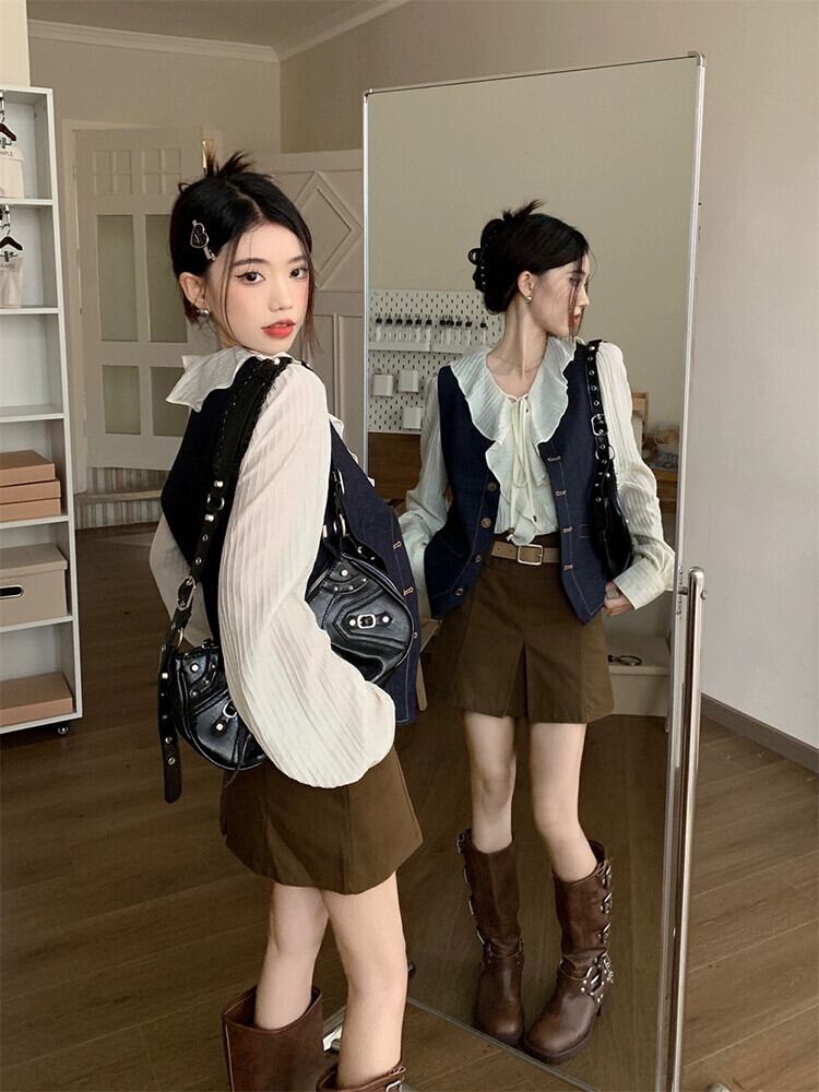 色:デニムブルーベスト,ブラウンスカート(ベルトは付属しません),アプリコットシャツ