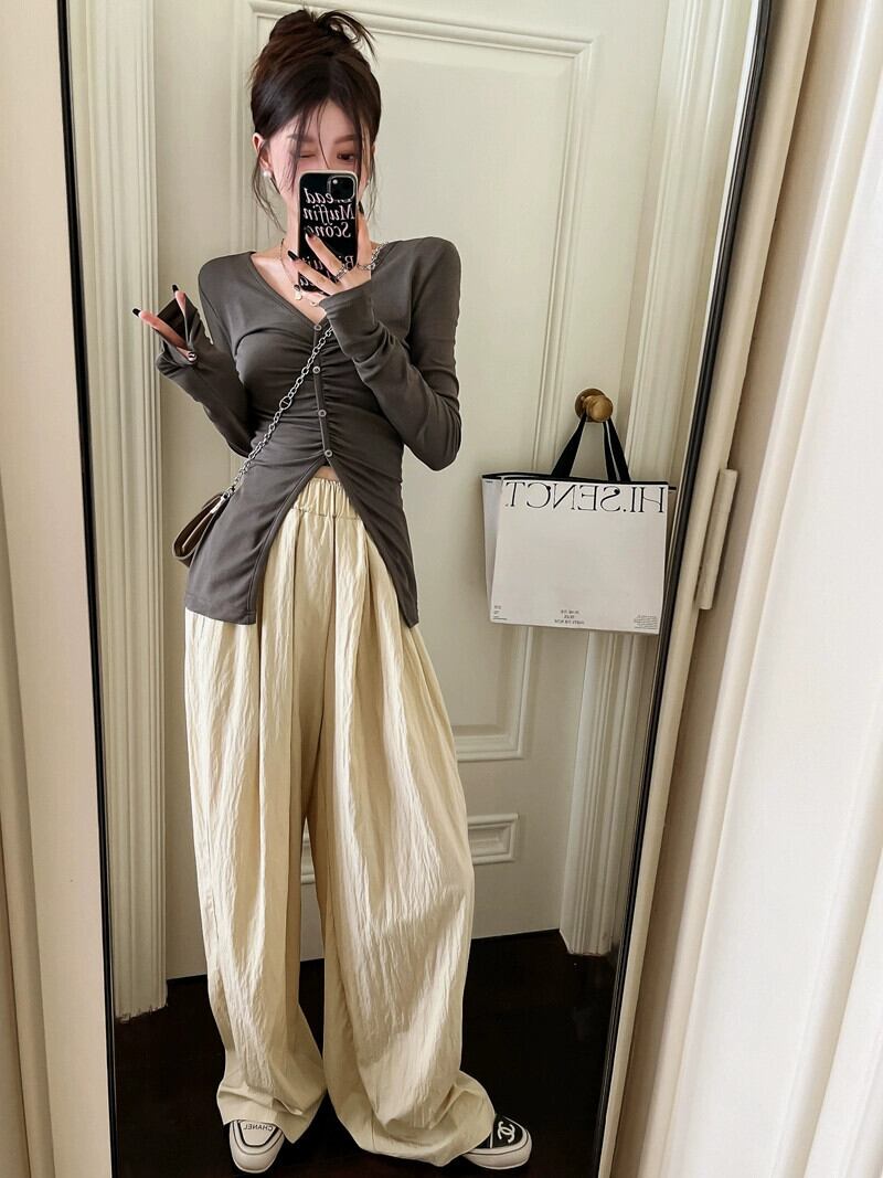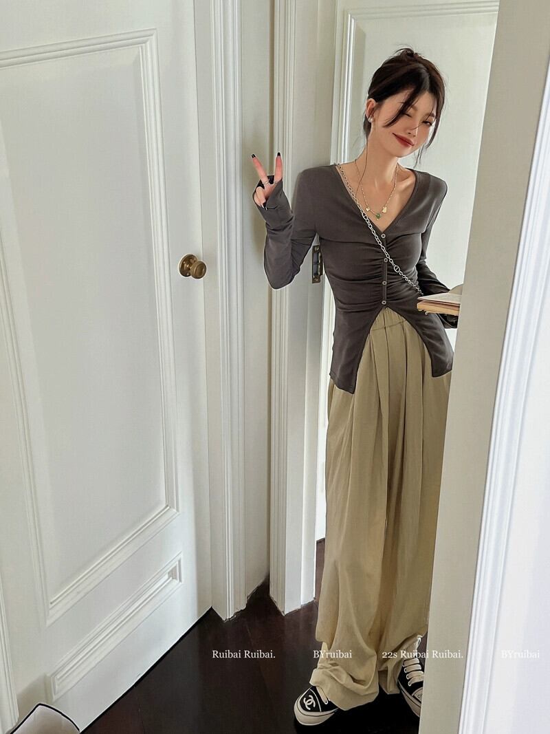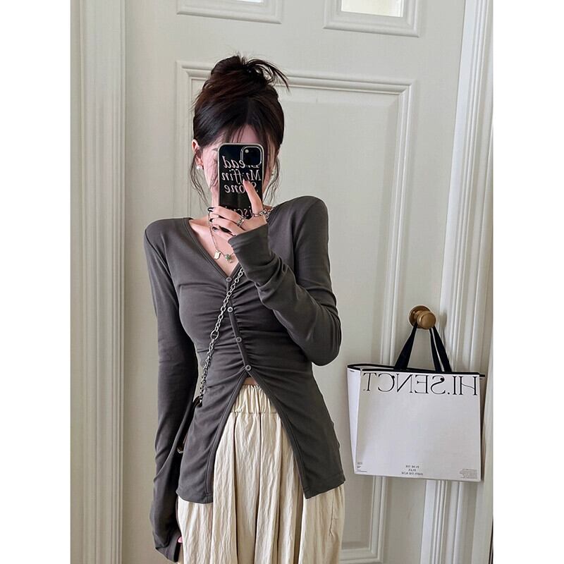 ニッチデザイン V ネック T シャツレディース 2023 夏の新作スリムフィットと丁寧な長袖カーディガントップ ロング サマー 夏物 Vネック Tシャツ missk48522046316
