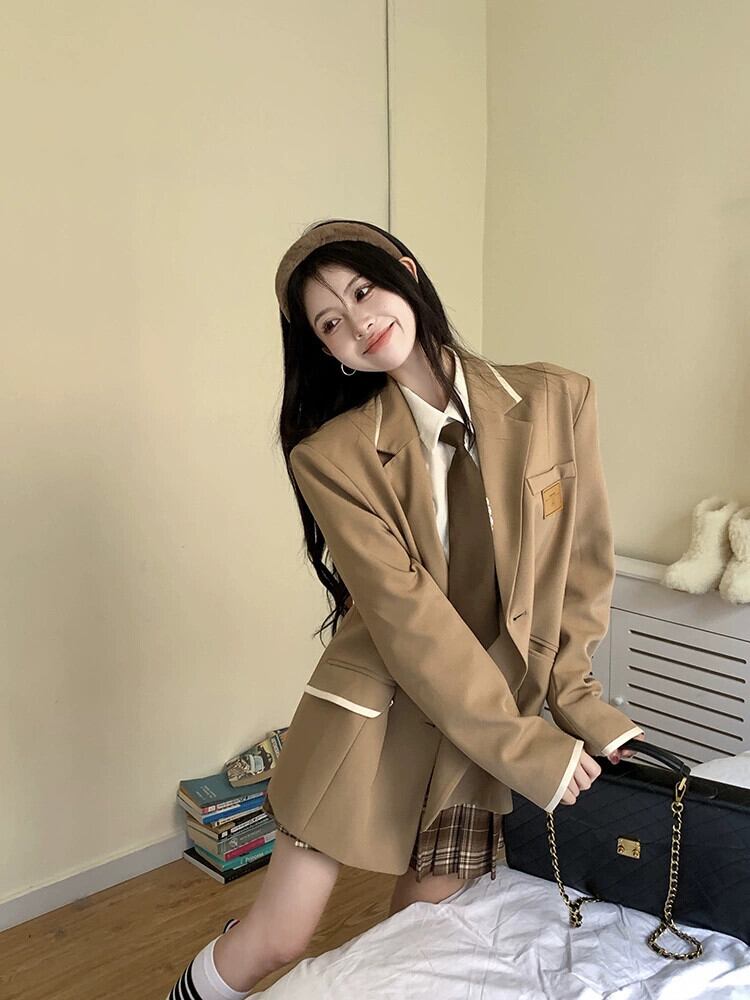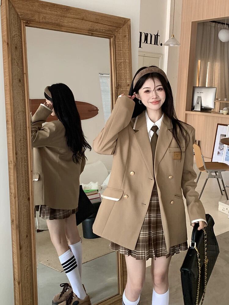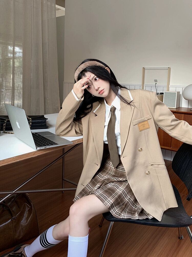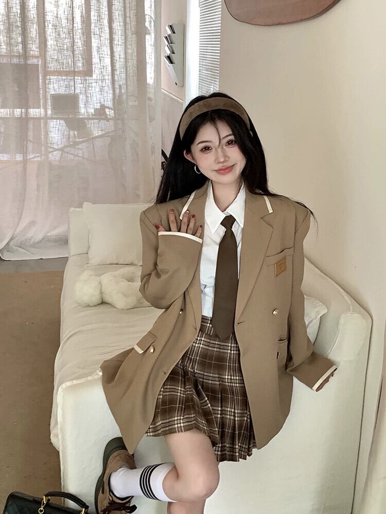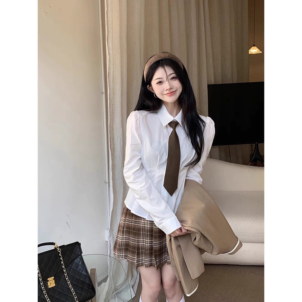 色:シャツとネクタイ,チェック柄スカート,コーヒースーツ