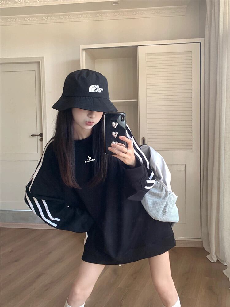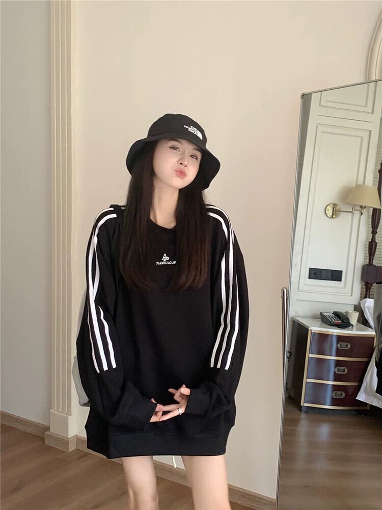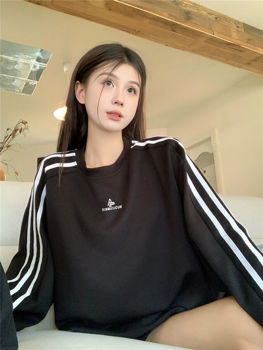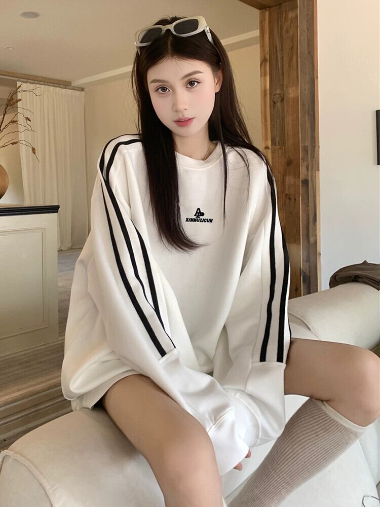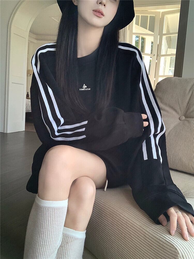 ストライプ刺繍長袖トレーナー女性秋バージョン 2023 新しいカップルルーズミッドレングススポーツカジュアルトップ ロング レッド オータム 秋物 missk71432942387