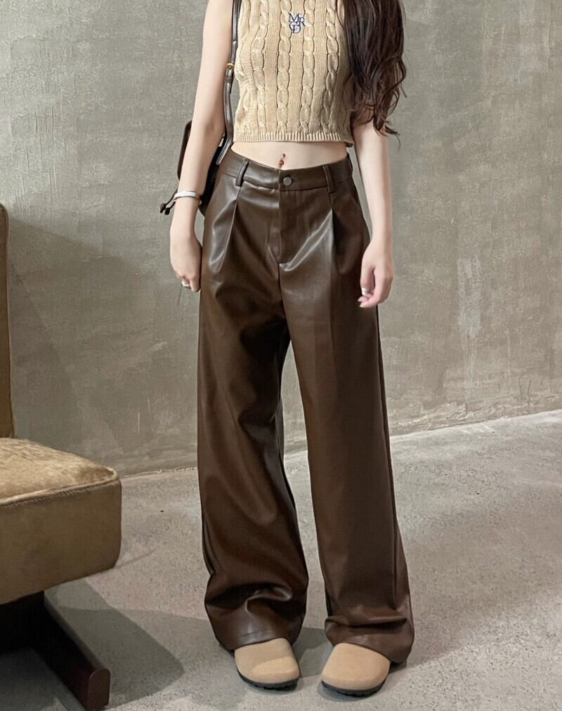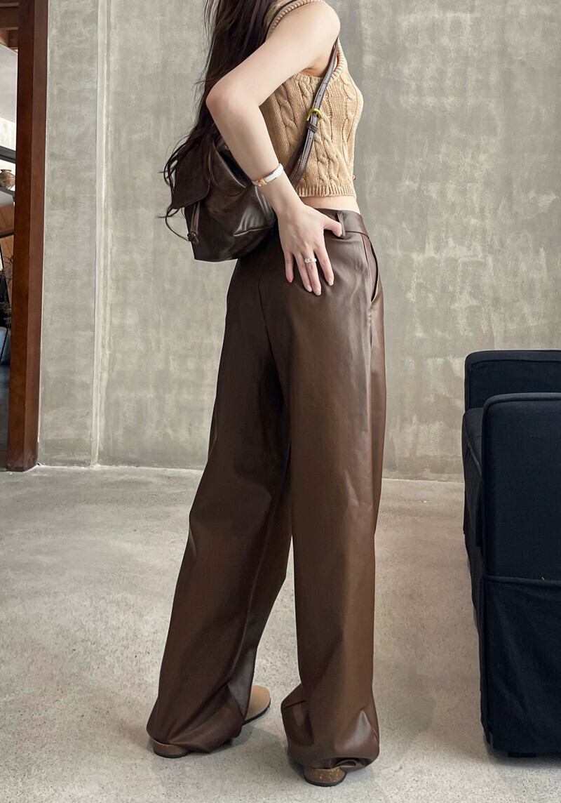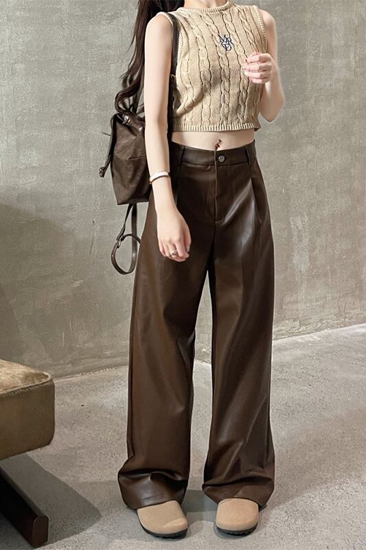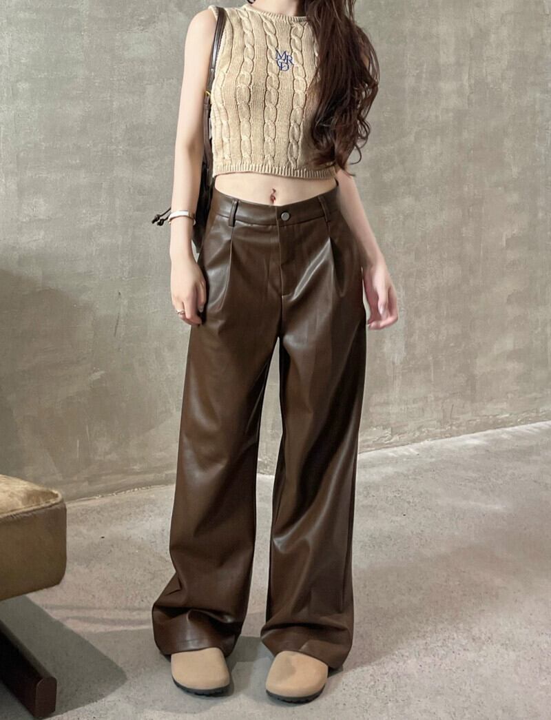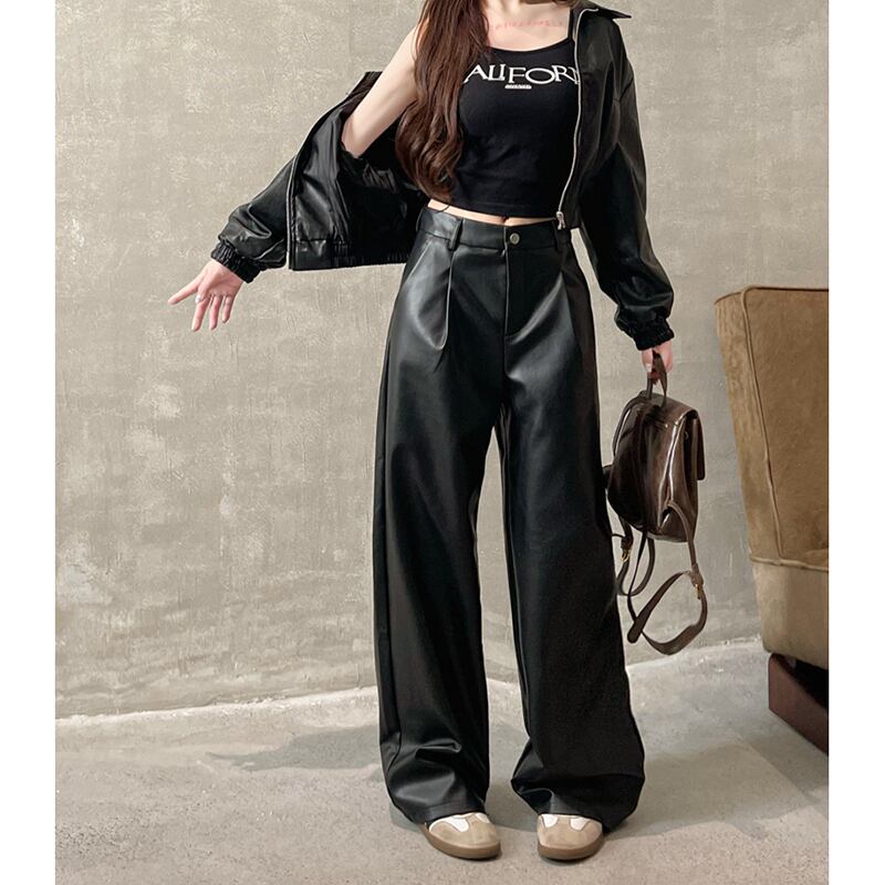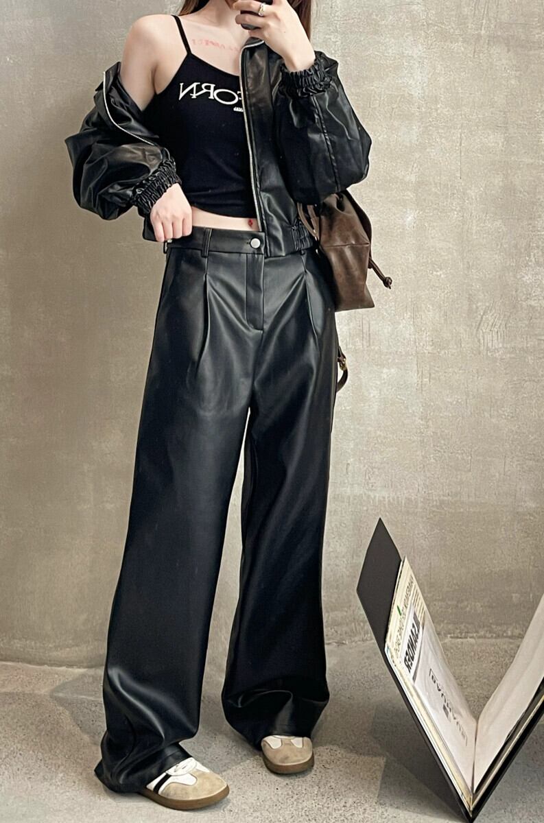 PU レザーワイドレッグパンツの女性 2023 秋の新しいハイウエストスリムレトロデザインカジュアルフロアレングスレザーパンツトレンディ オータム 秋物 missk73837756143