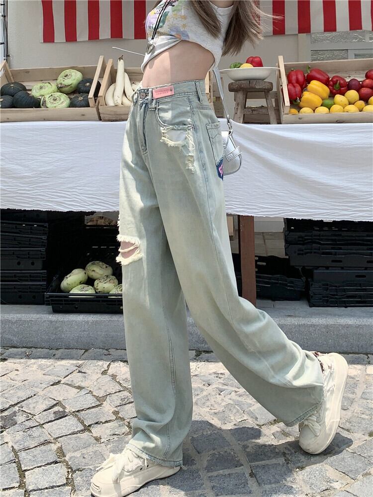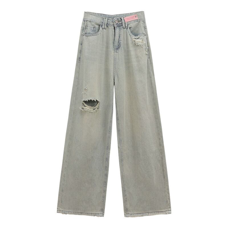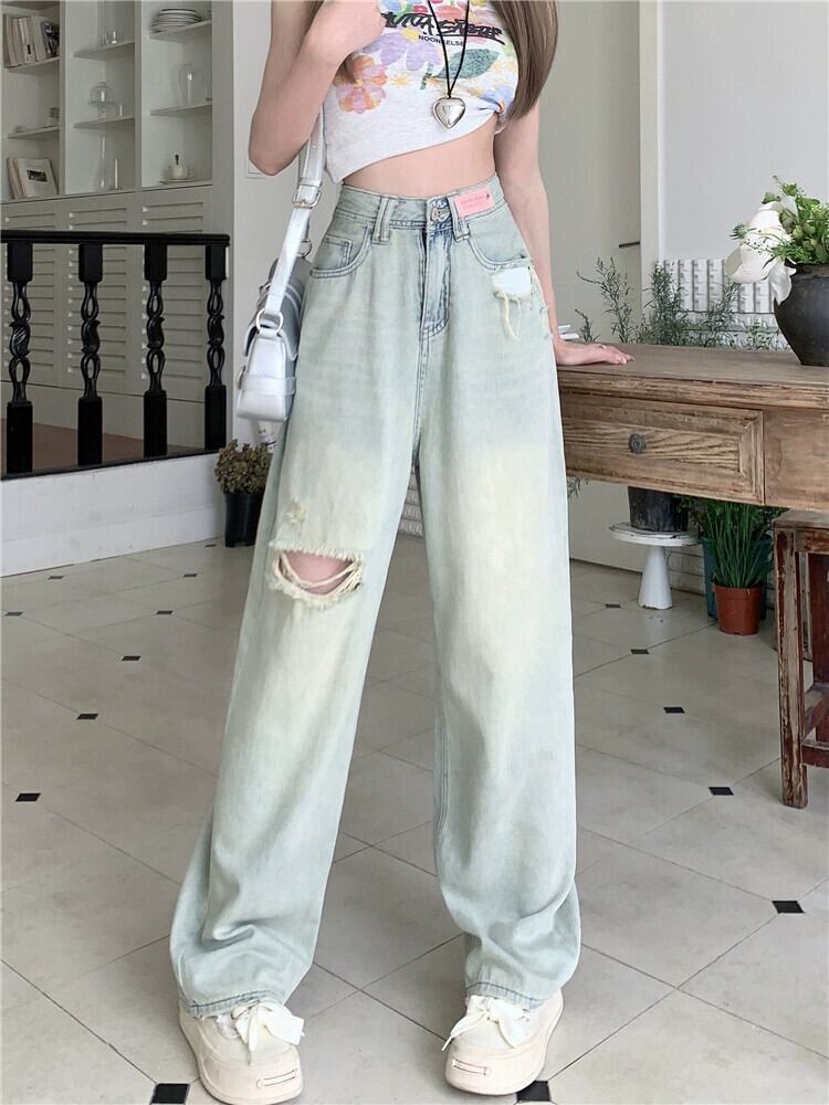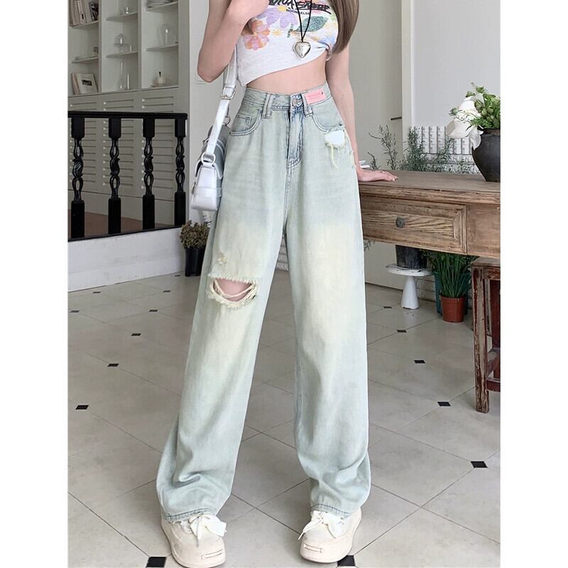 ライトカラーリッピングジーンズ女性夏2023新しいアメリカンレトロデザインハイウエスト痩身ワイドレッグフロアモップパンツ ハイウェスト サマー 夏物 ワイドパンツ missk74829427482