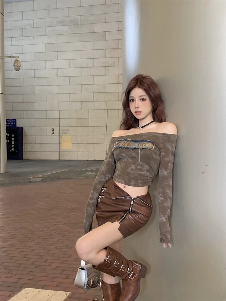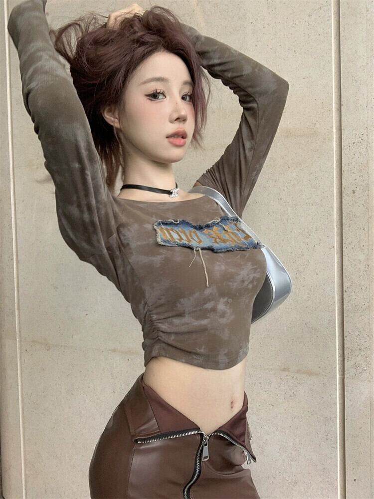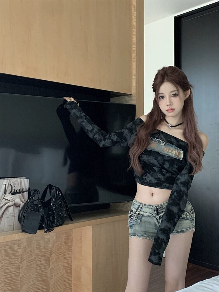 アメリカのワンショルダー長袖 Tシャツの女性の秋 2023 新しいスタイルの絞り染めショートスタイルプリーツトップトレンディ ロング オータム 秋物 missk72188596373