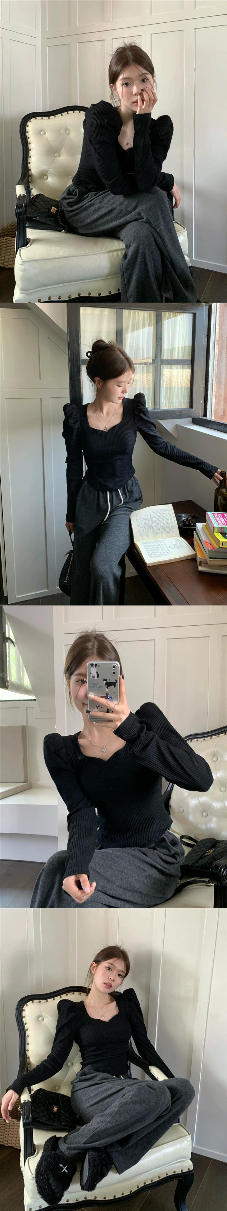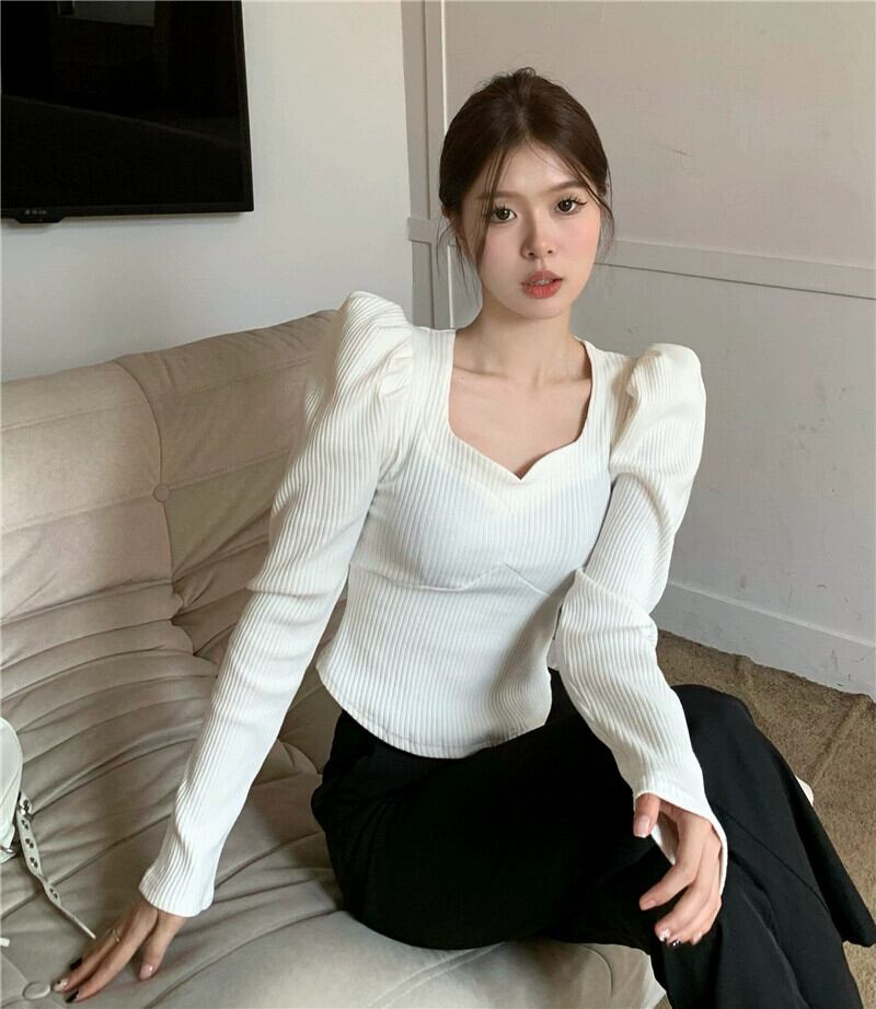 フレンチニッチスクエアネックパフスリーブセーターレディース2023年秋新作スリムフィットアウター長袖トップ ロング スクウェア missk95961294297