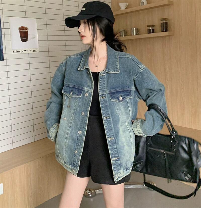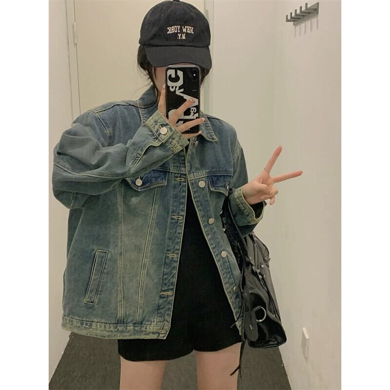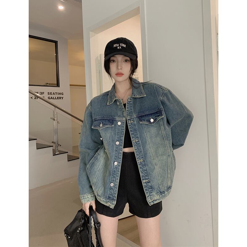 ポロ襟ウォッシュ加工デニムジャケット秋 2023 新しいカジュアルデザインルーズカーディガントップス婦人服 オータム 秋物 missk68029136110