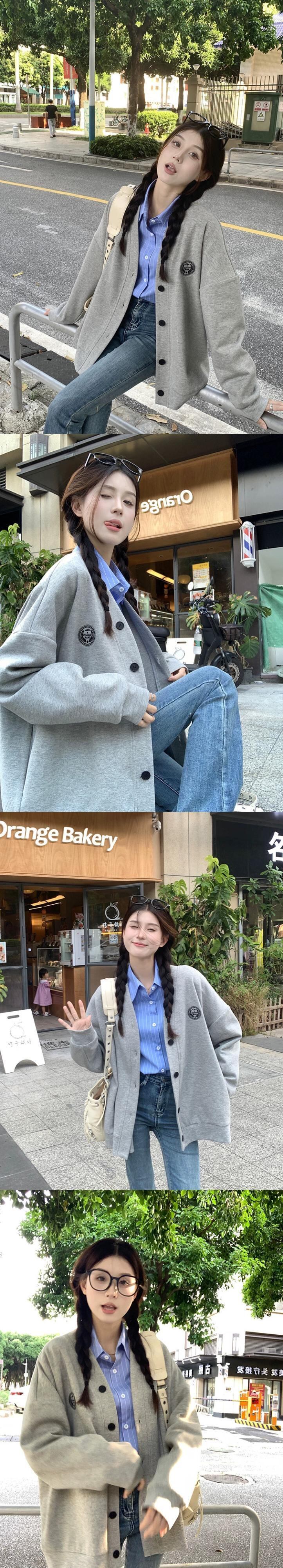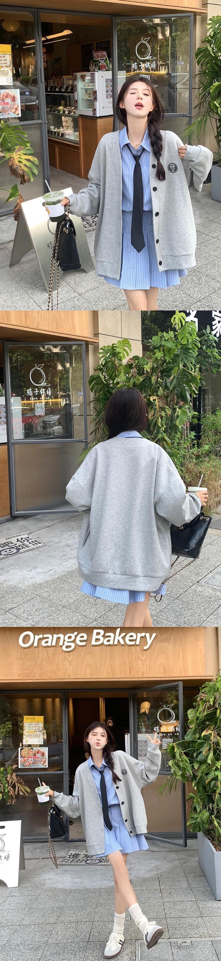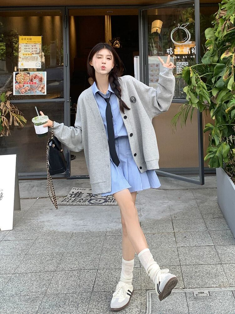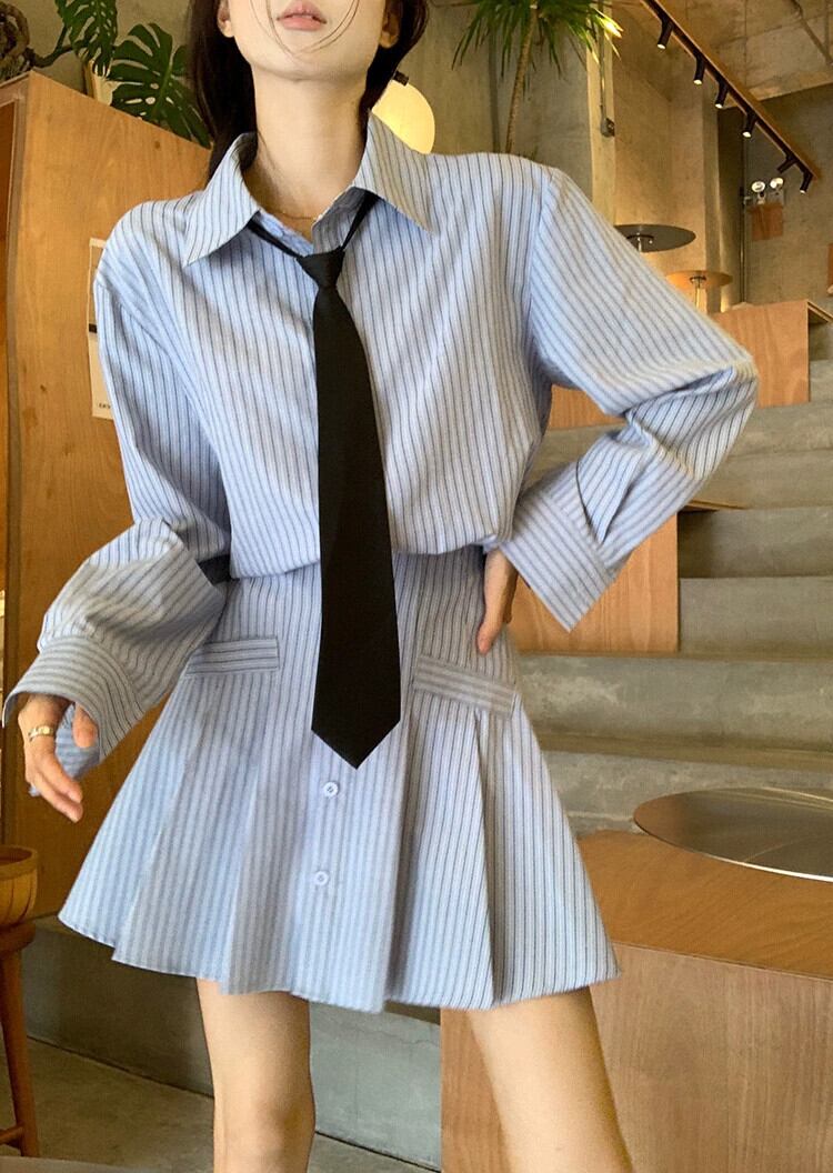 色:ブルーストライプのシャツワンピース+ネクタイ,グレーの野球ユニフォームカーディガンスウェットシャツ,シャツ