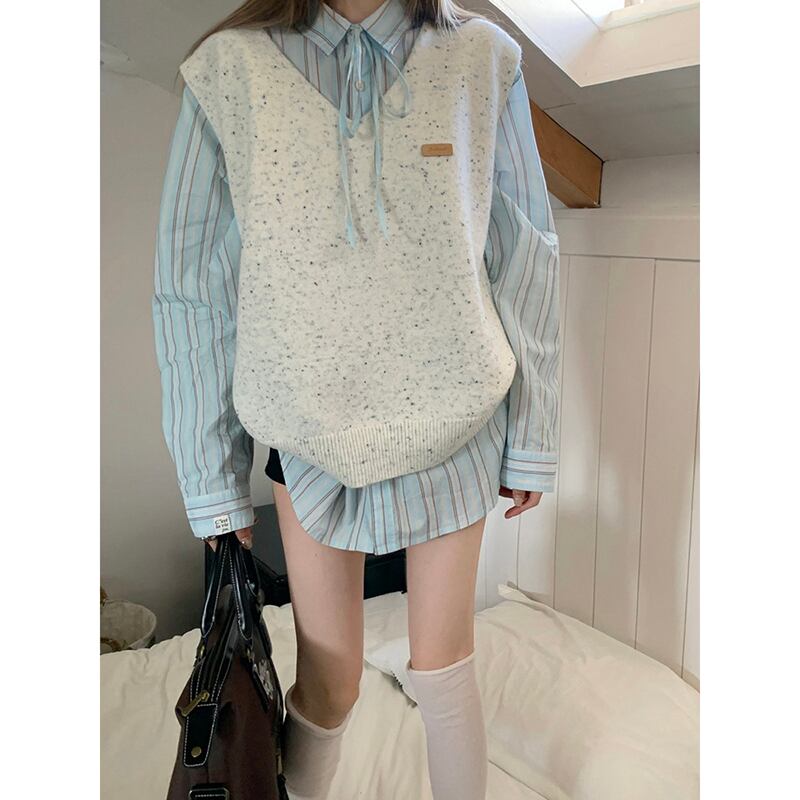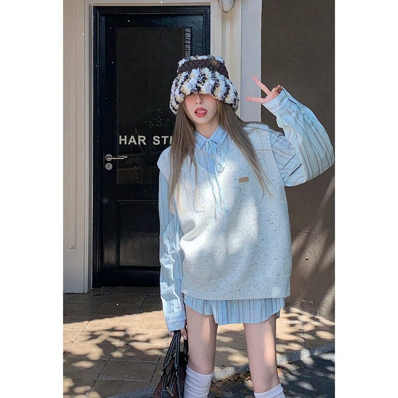 スタイル V ネック積層ルーズセーターベストストライプ長袖シャツ女性秋 2023 新しいファッションスーツ ロング オータム 秋物 Vネック missk10705214098