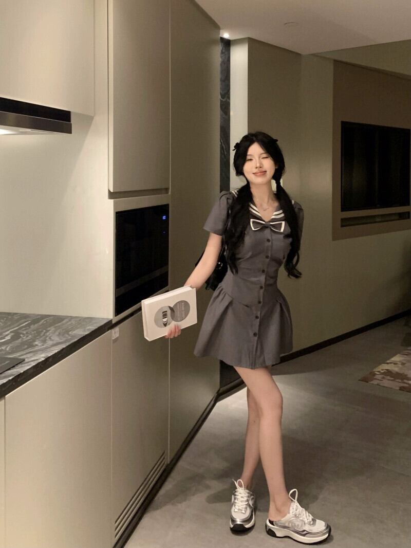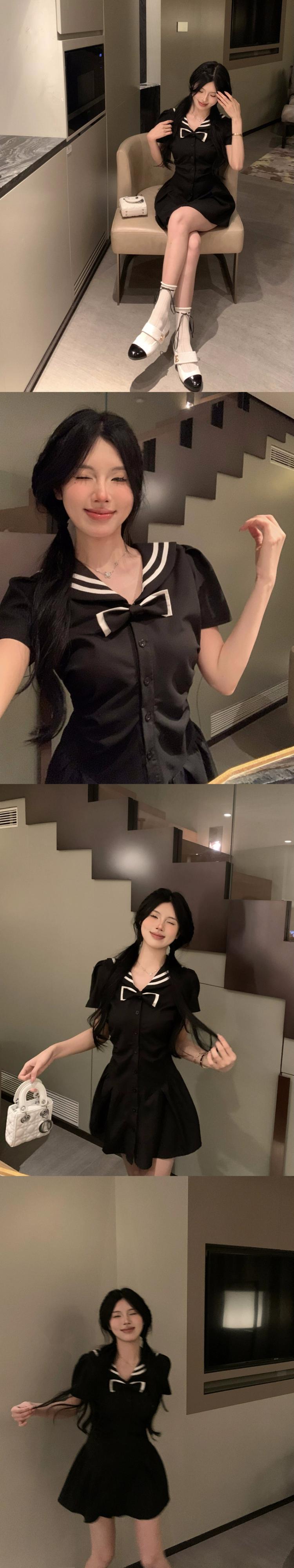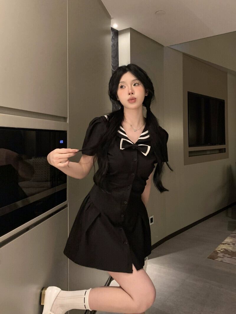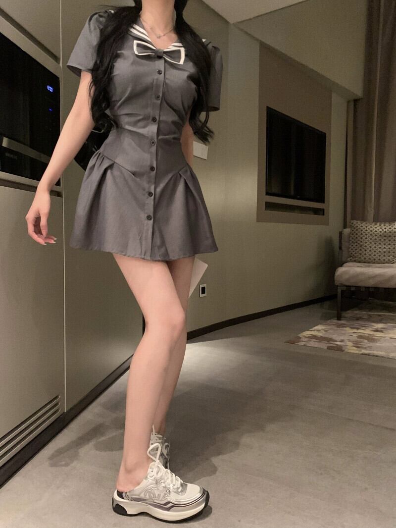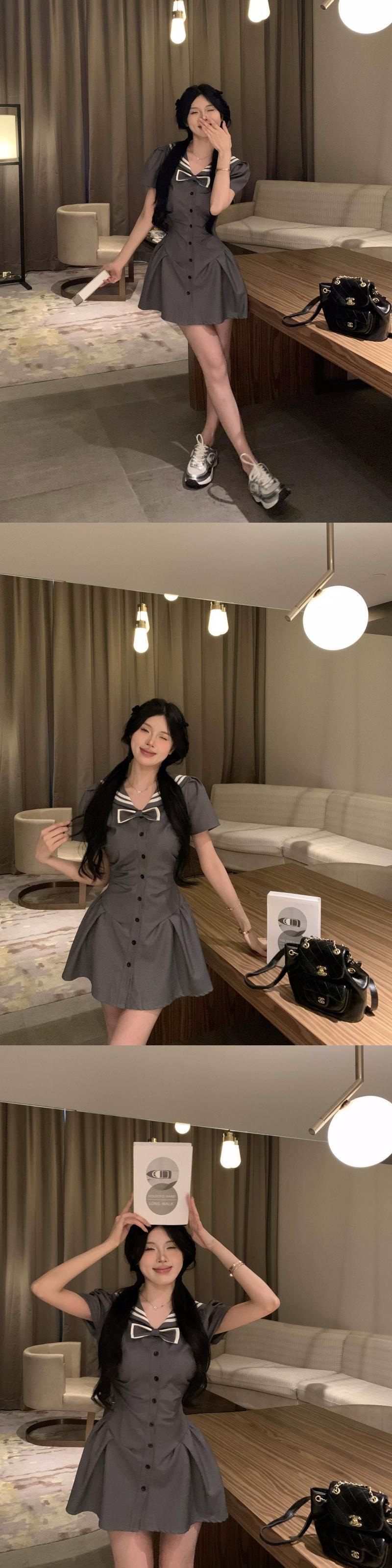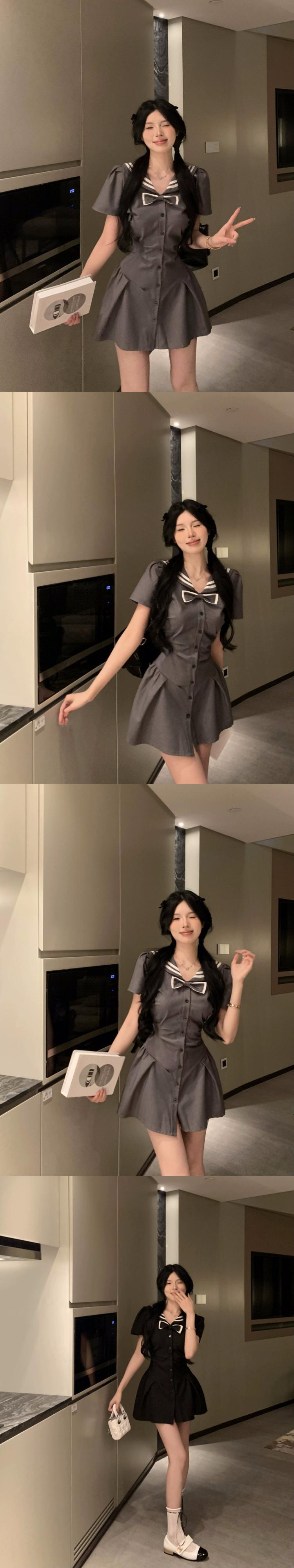 ネイビーカラー甘くてスパイシーな半袖ドレスの女性の夏 2023 新しいスタイルウエスト痩身リボンプリーツショートスカート 大人ガーリー スウィート キュート カジュアル サマー 夏物 missk64394368101
