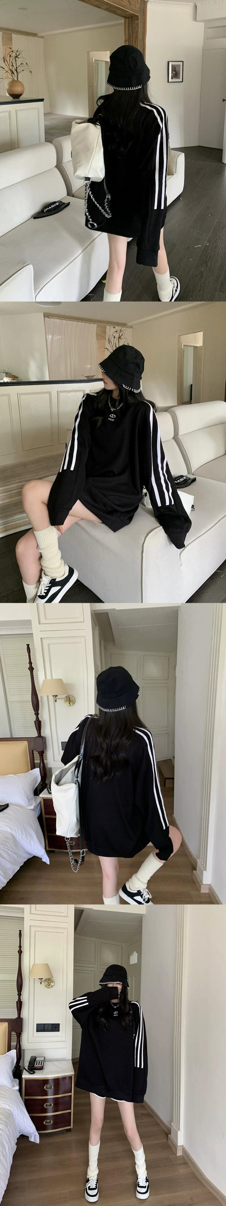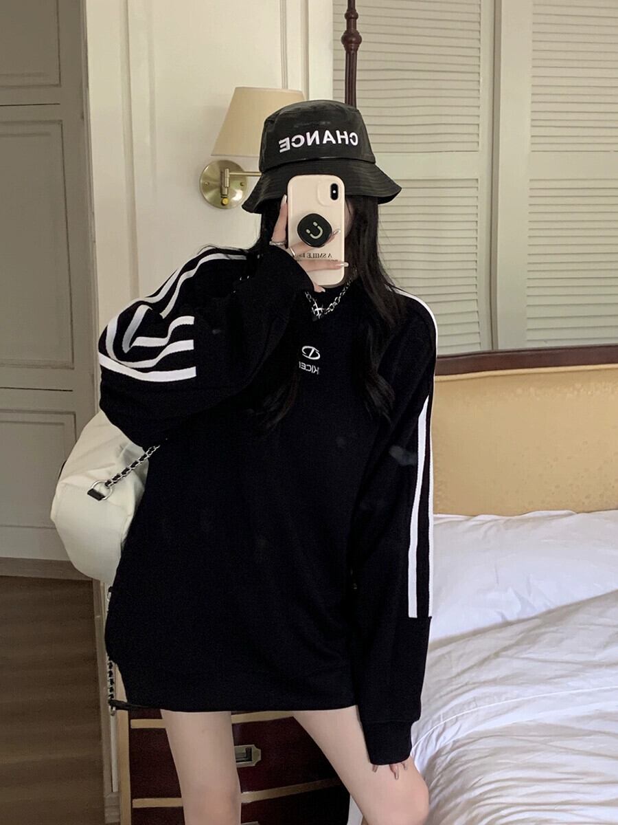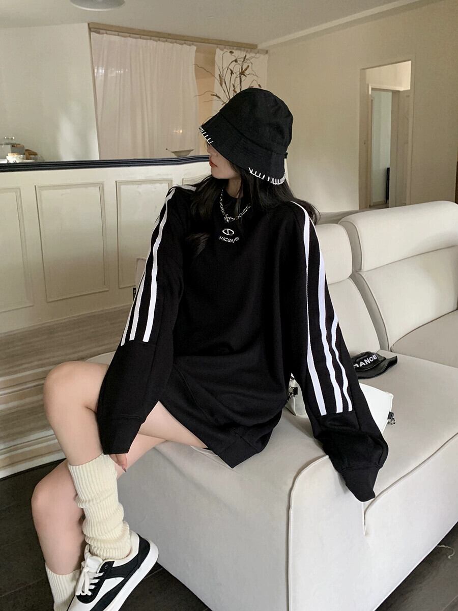 刺繍カラーブロックストライプ長袖トレーナー女性秋バージョン 2023 新しいカップルスタイルルーズミッドレングストップトレンディ ロング レッド オータム 秋物 missk30004394968