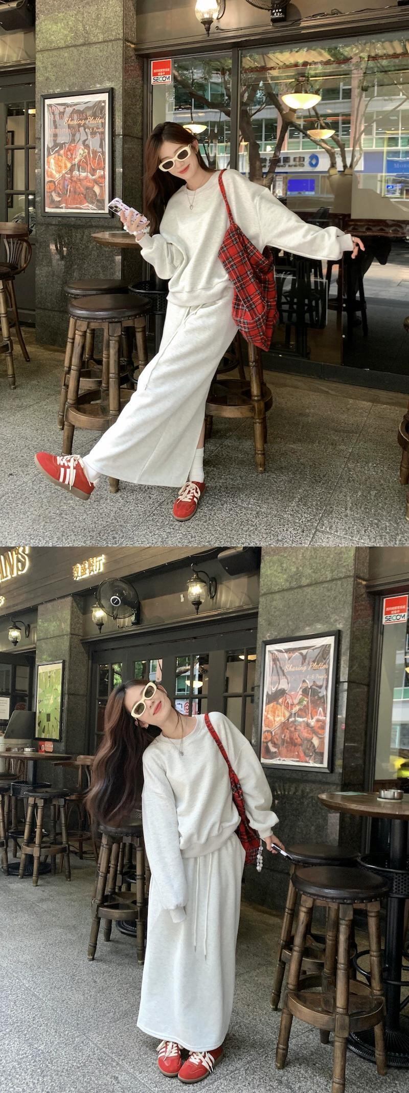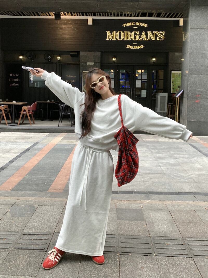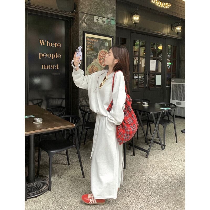 怠惰なスタイルラウンドネック長袖トレーナー弾性ウエストスリットハーフレングススカート女性秋 2023 新しいファッションツーピースセット ロング エラスティック 伸縮 オータム 秋物 Oネック missk47712102061