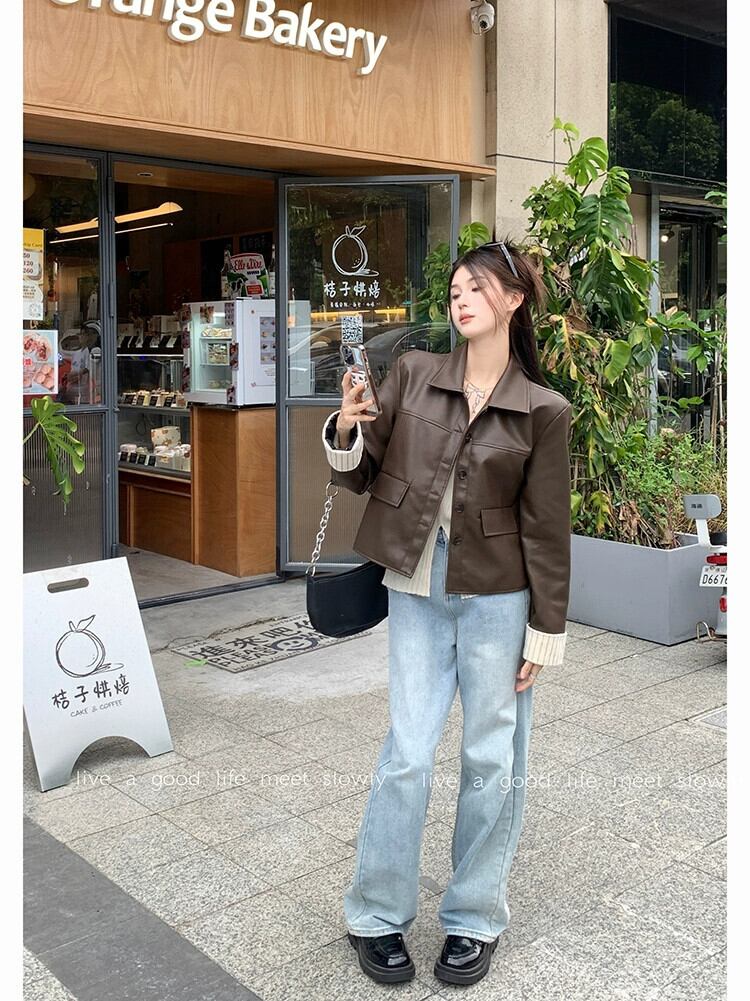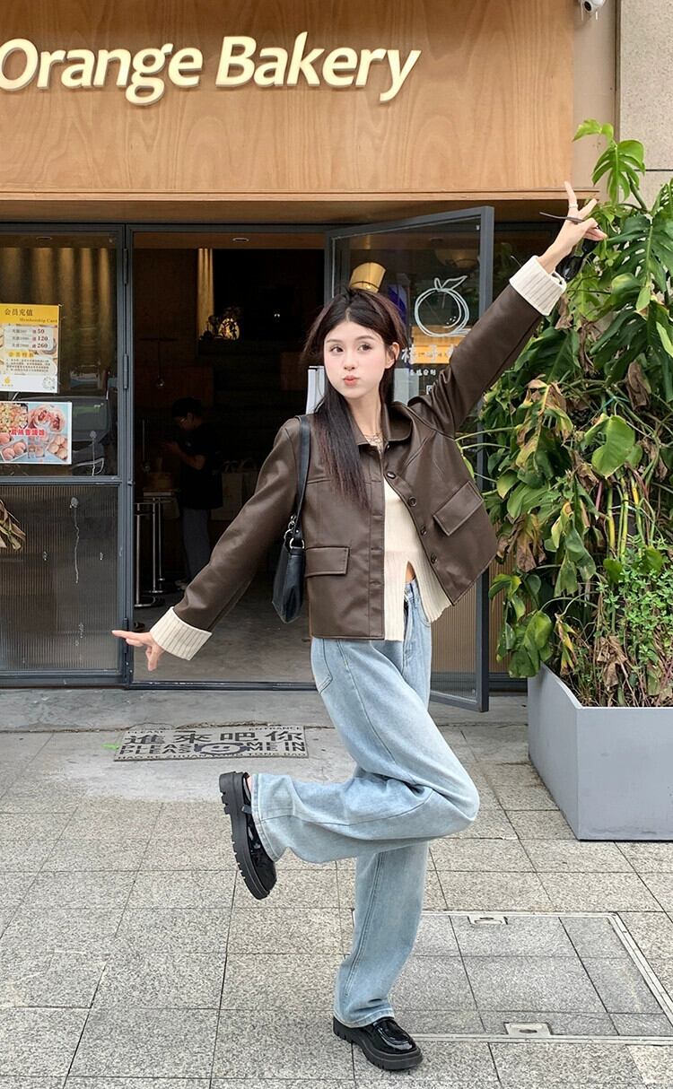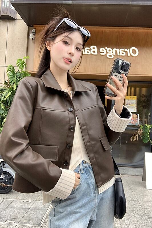 色:コーヒーカラーのレザージャケット,アプリコットシャツ