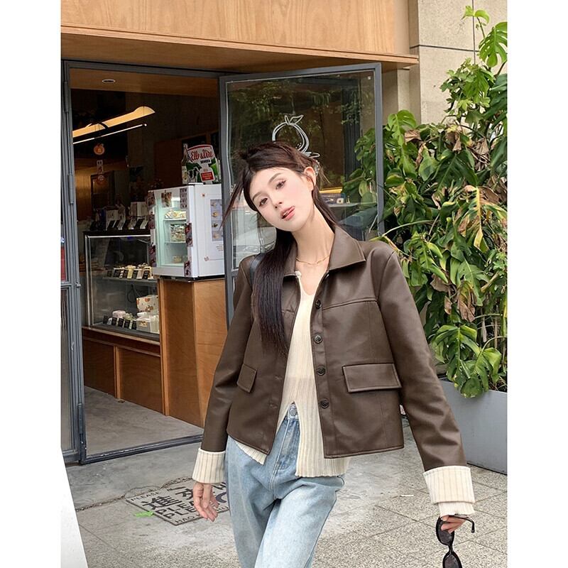 香港スタイル長袖レザージャケットの女性の秋 2023 新しいスタイル対照的なカラースプライシングデザインクールなルーズオートバイジャケット ロング オータム 秋物 missk86870513263