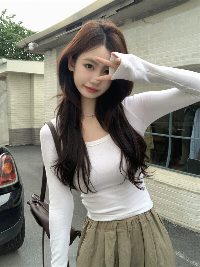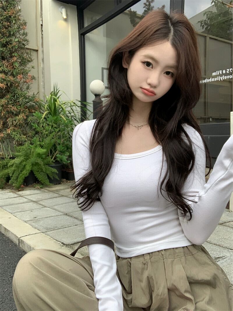 U ネックボトリングトップ女性秋バージョン 2023 新しいスリムフィットグレーインナーウェアショート長袖 T シャツ ロング オータム 秋物 Tシャツ missk65191382898
