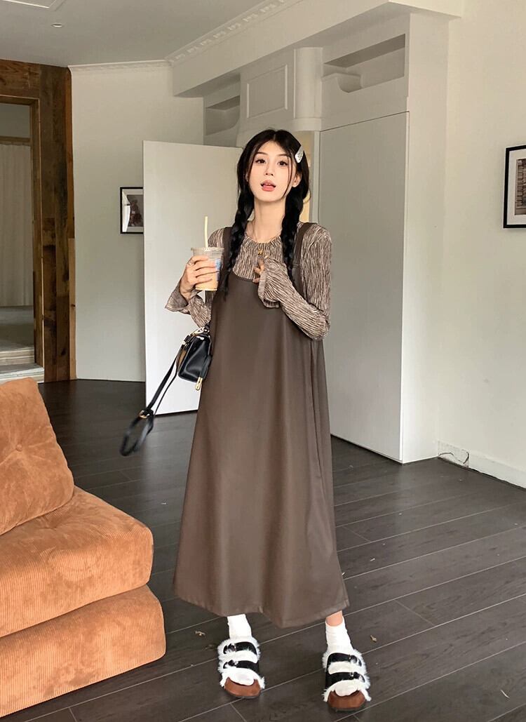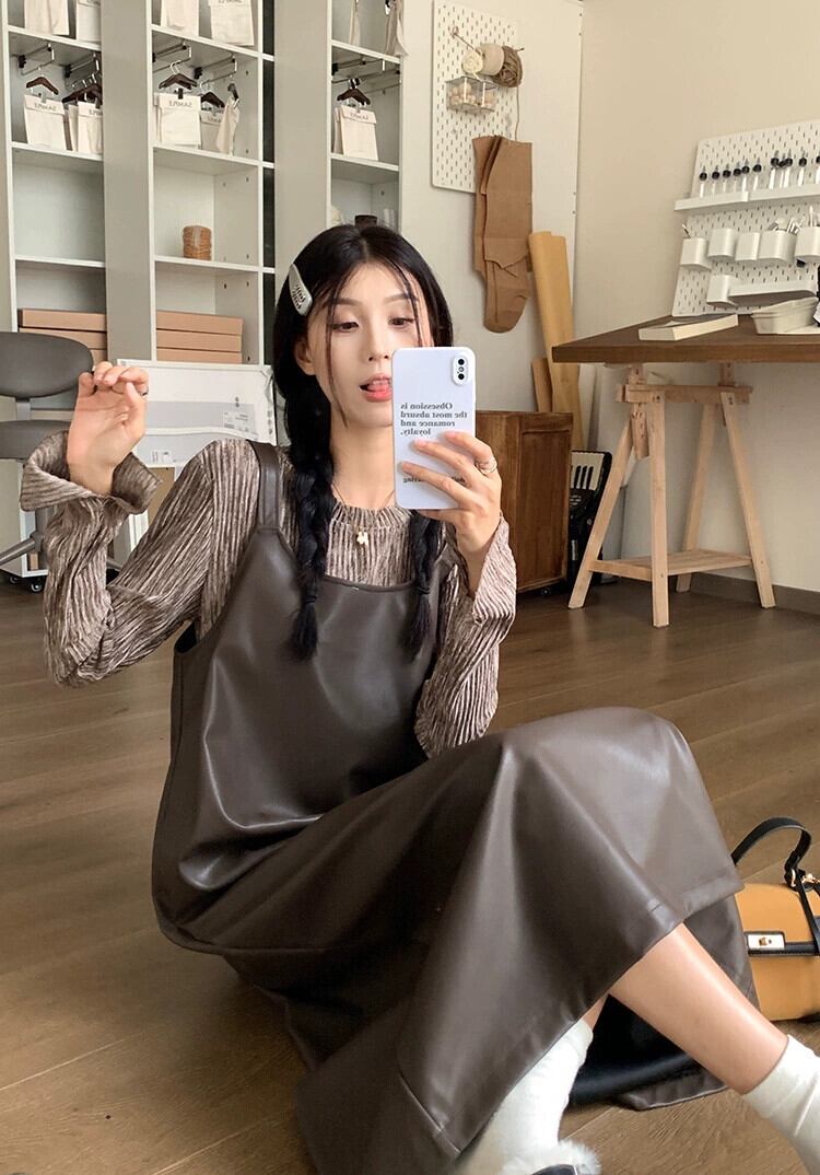 色:ブラウンレザーサスペンダースカート,テクスチャーボトムシャツ