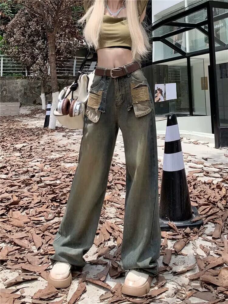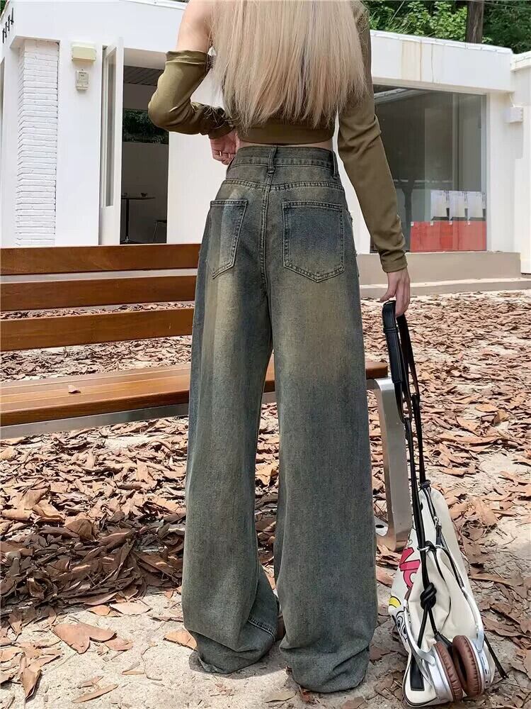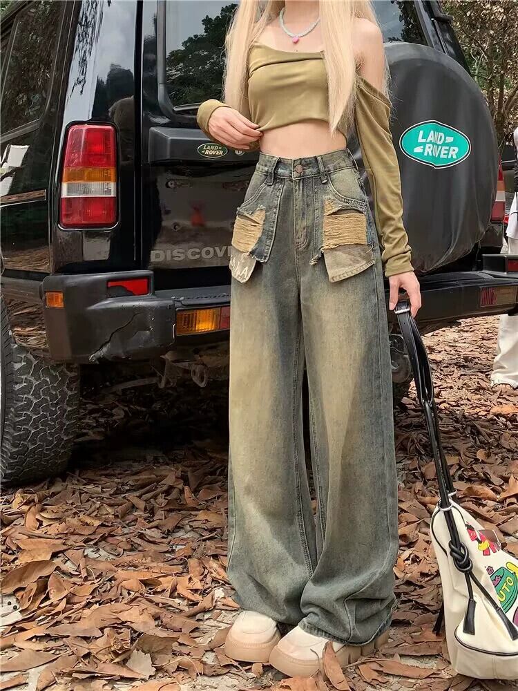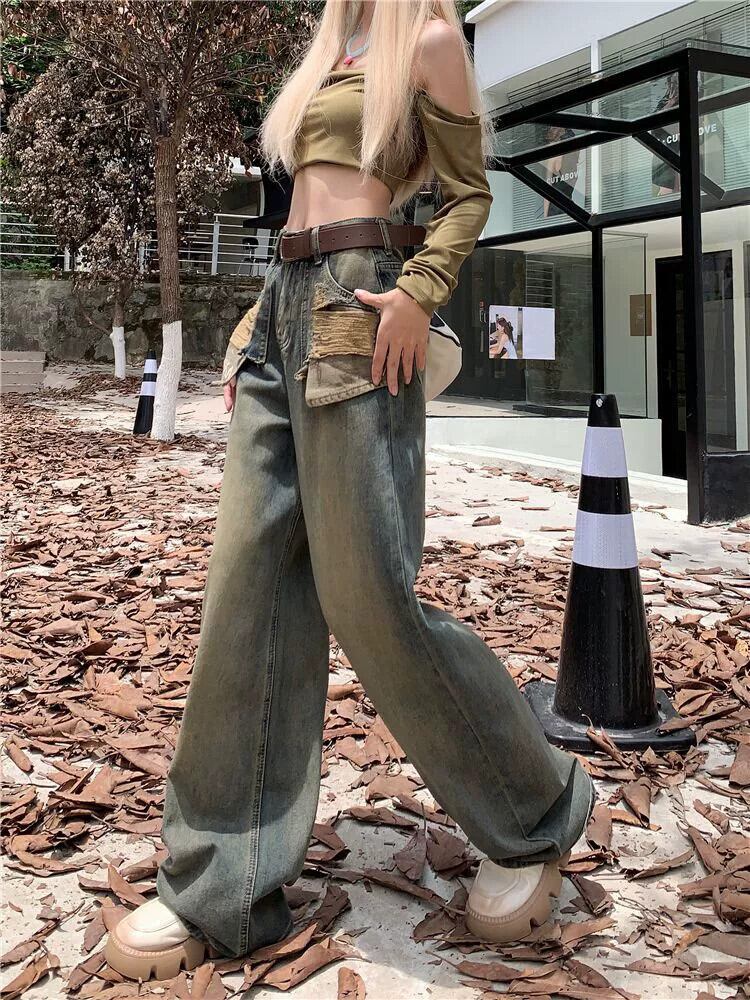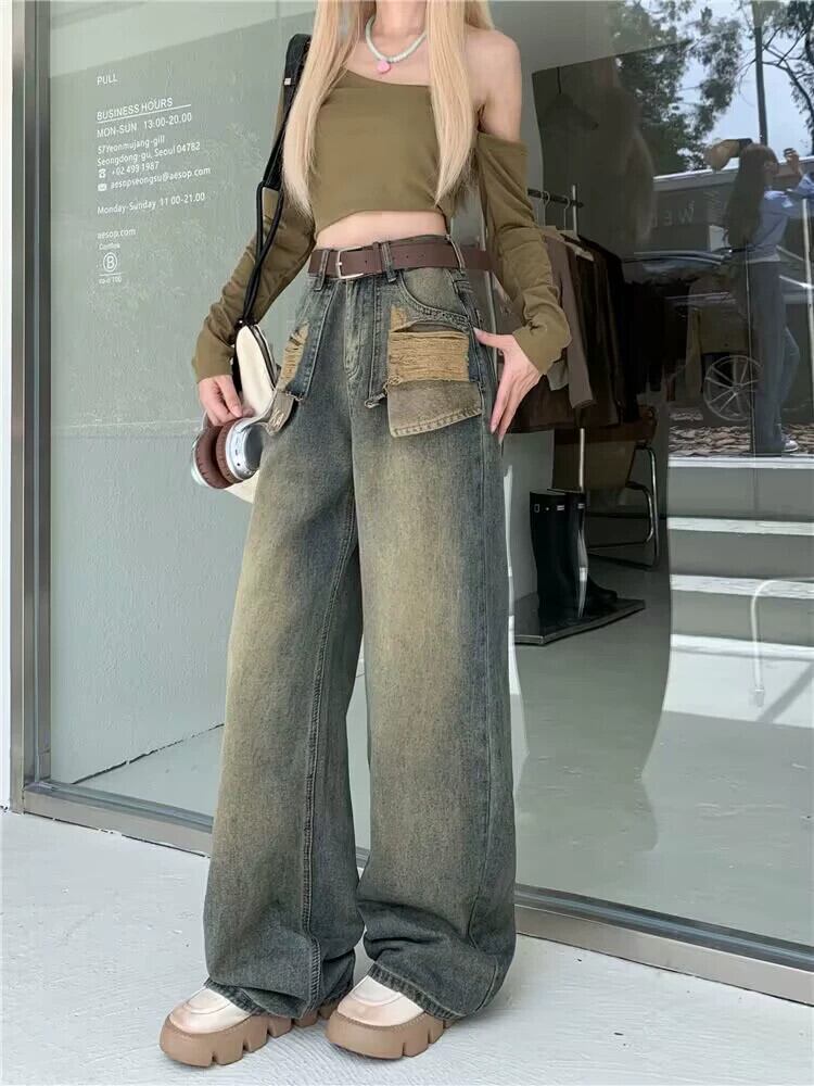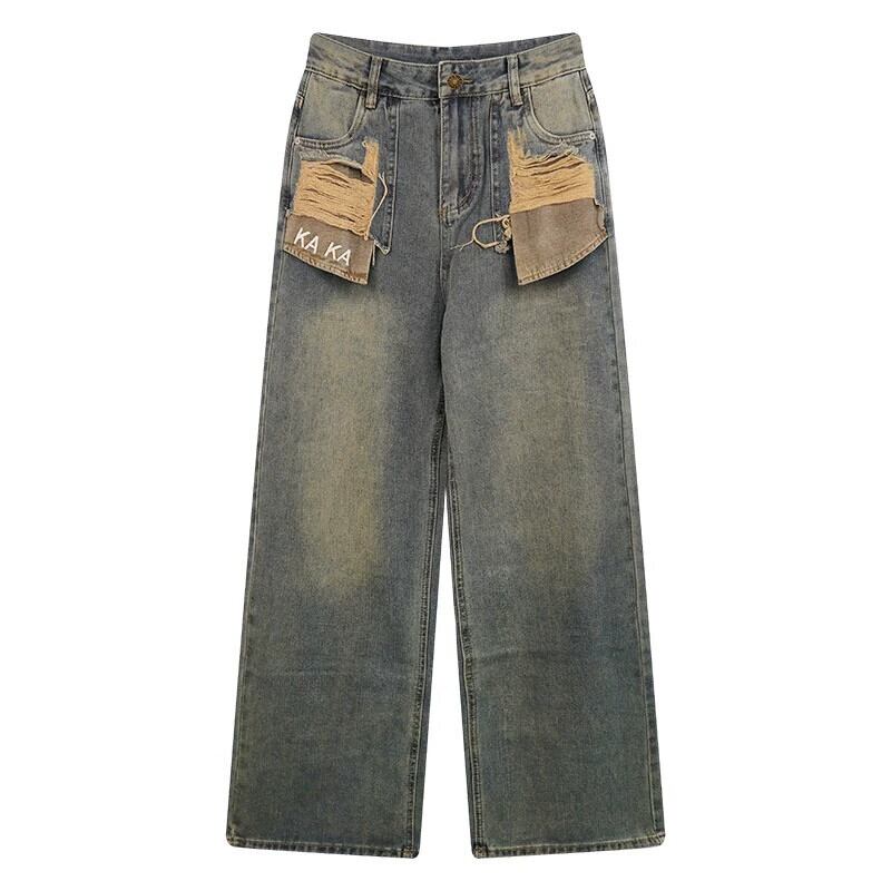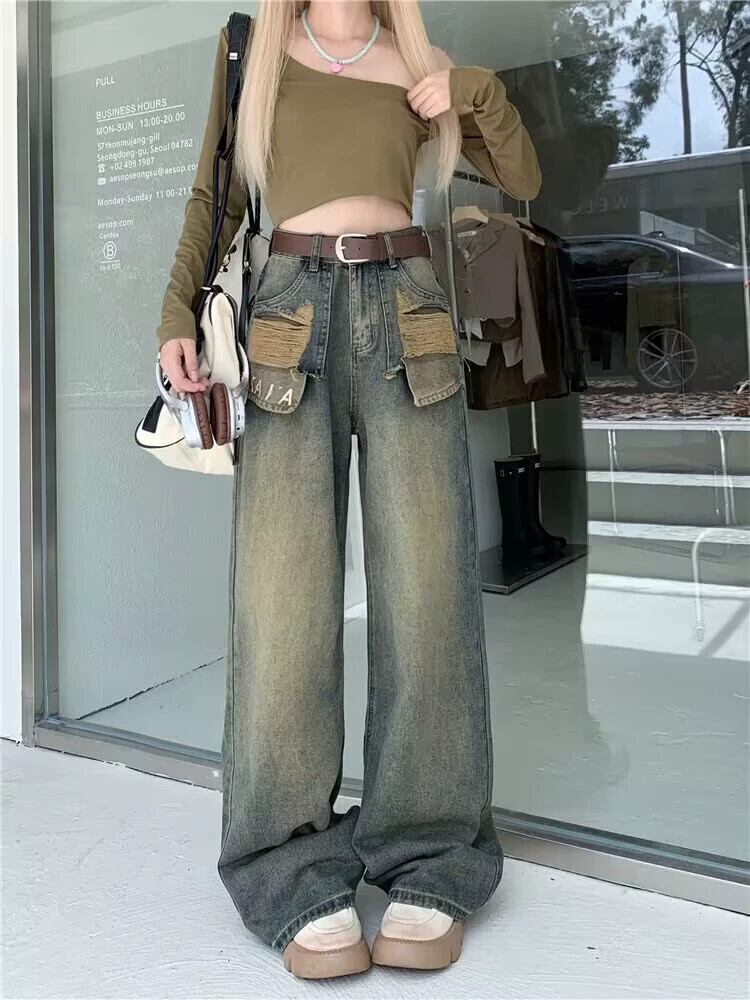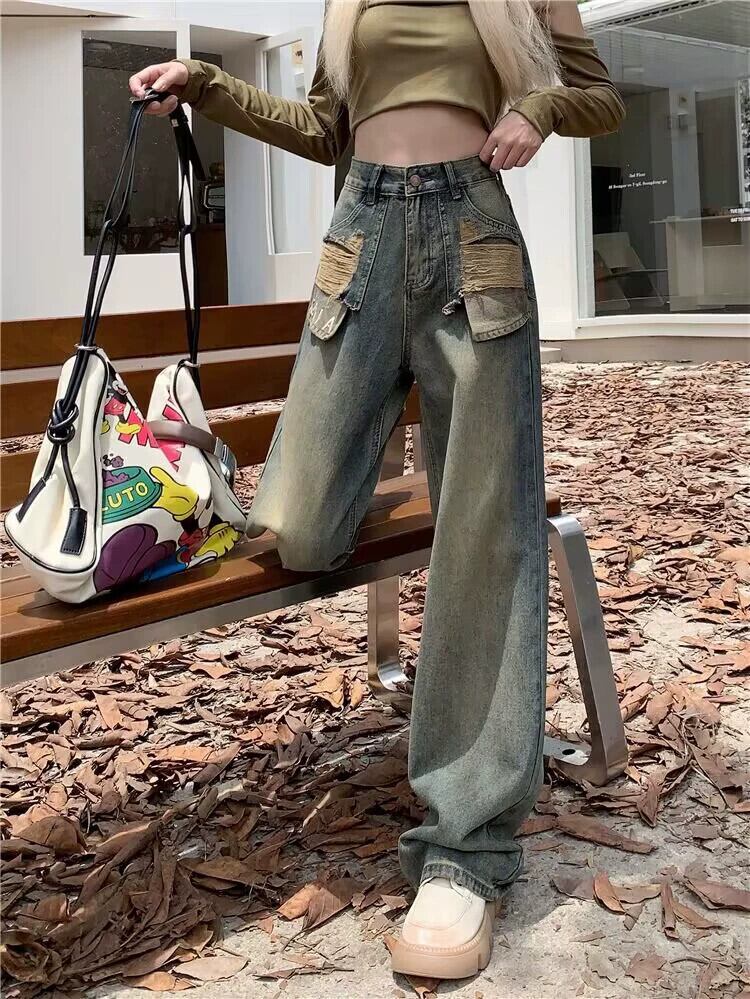 レトロな破れたジーンズの女性 2023 秋の新しい不規則なデザインのハイウエスト痩身ワイドレッグフロアレングスパンツ オータム 秋物 missk28922648954