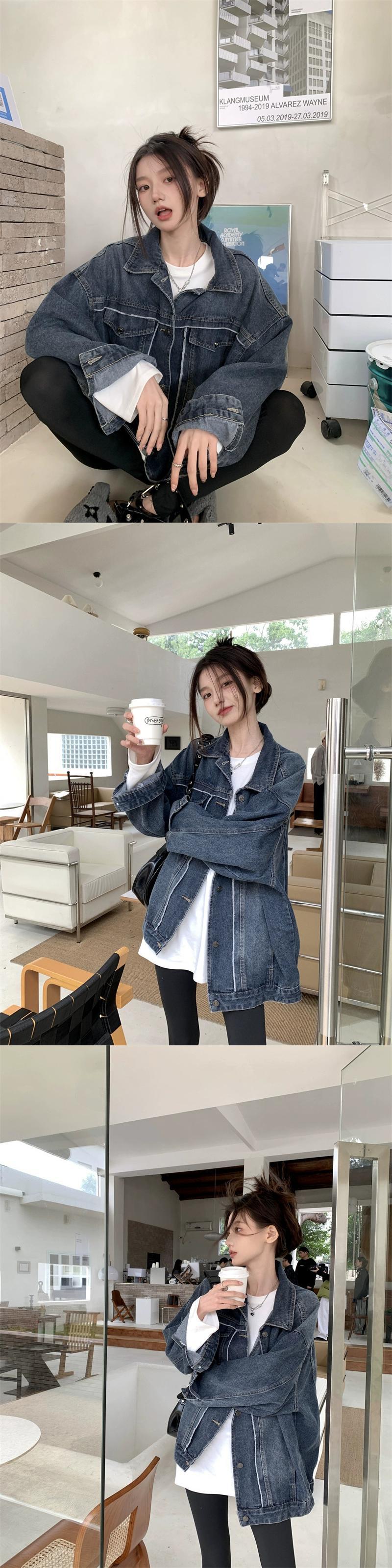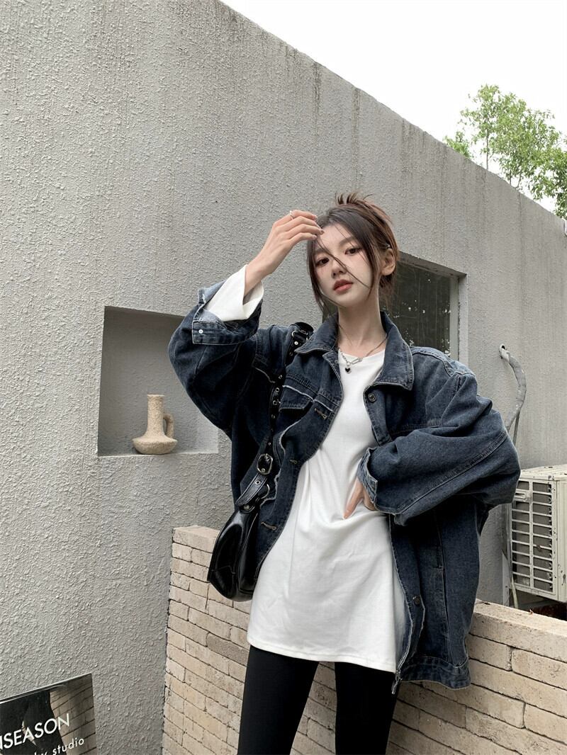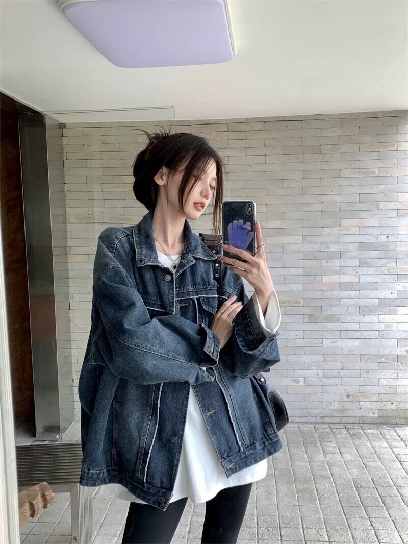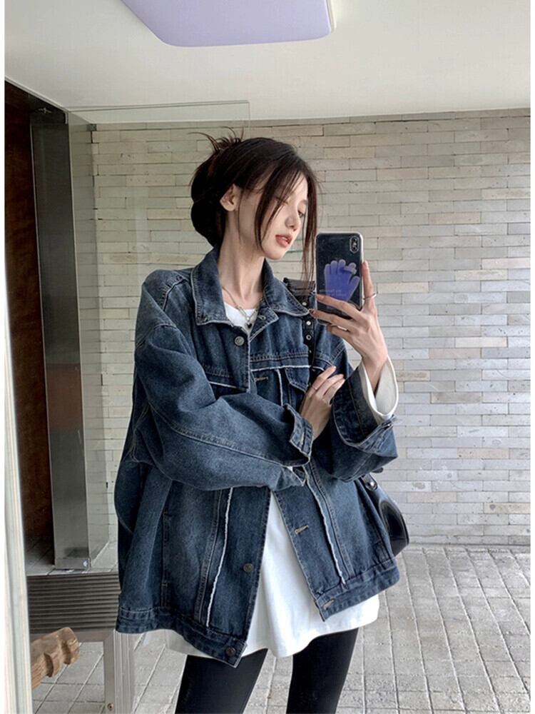 レトロウォッシュデニムジャケット女性秋 2023 新デザイン BF スタイルポロカラールーズ長袖トップトレンディ ロング オータム 秋物 missk63500909785