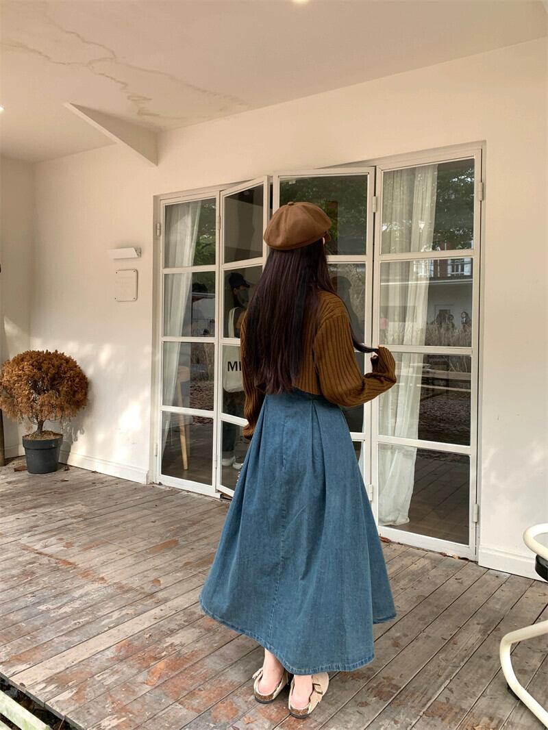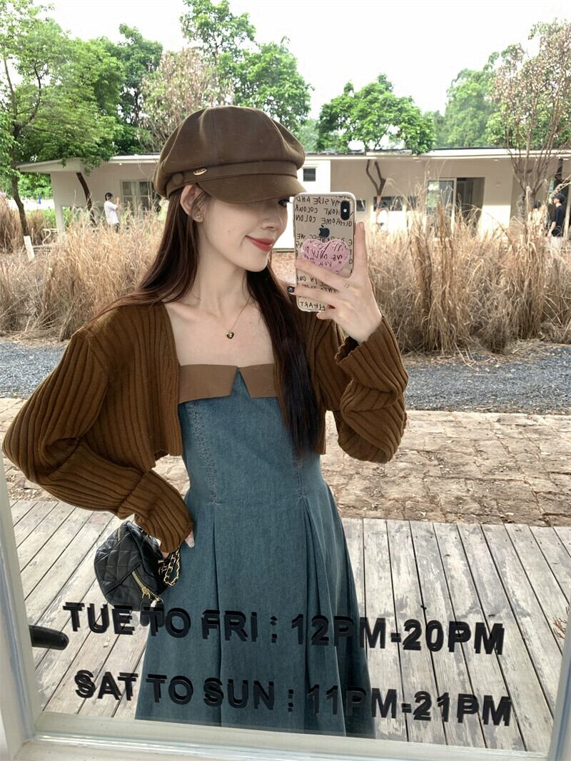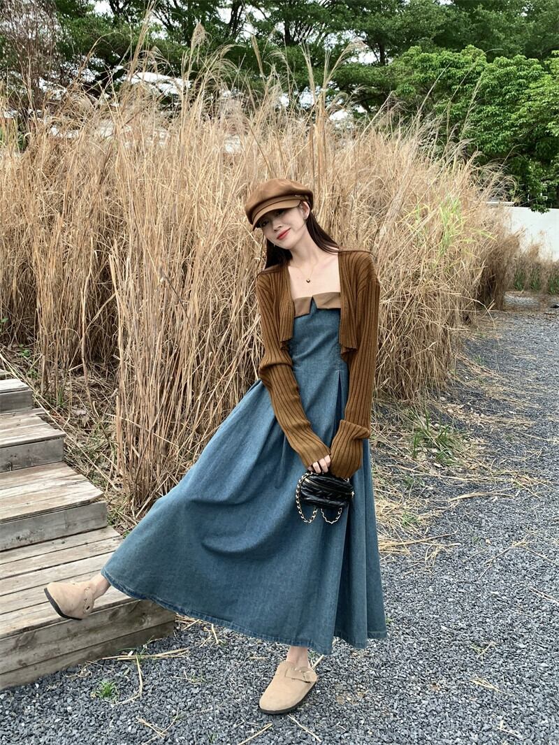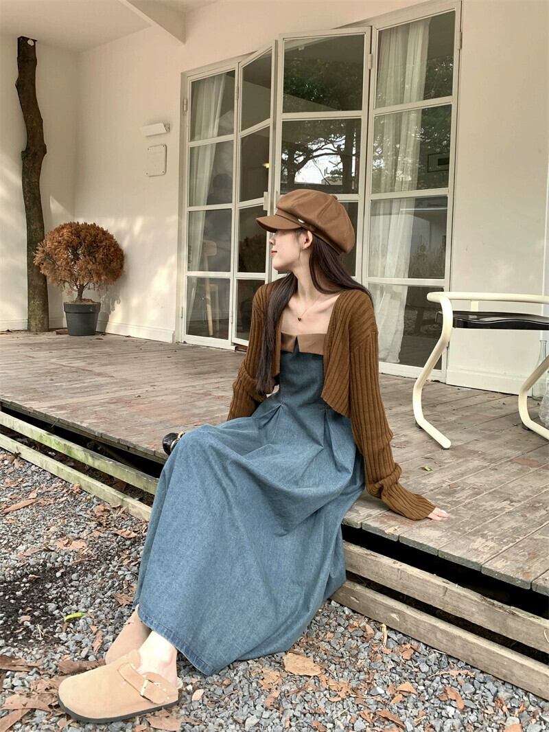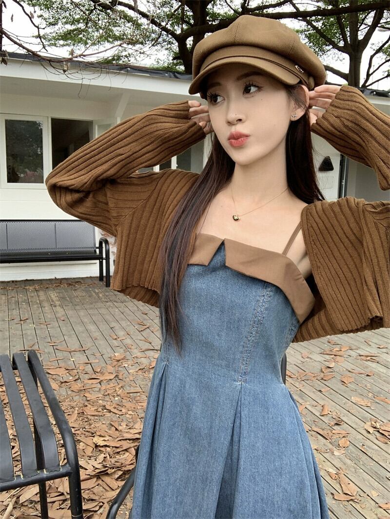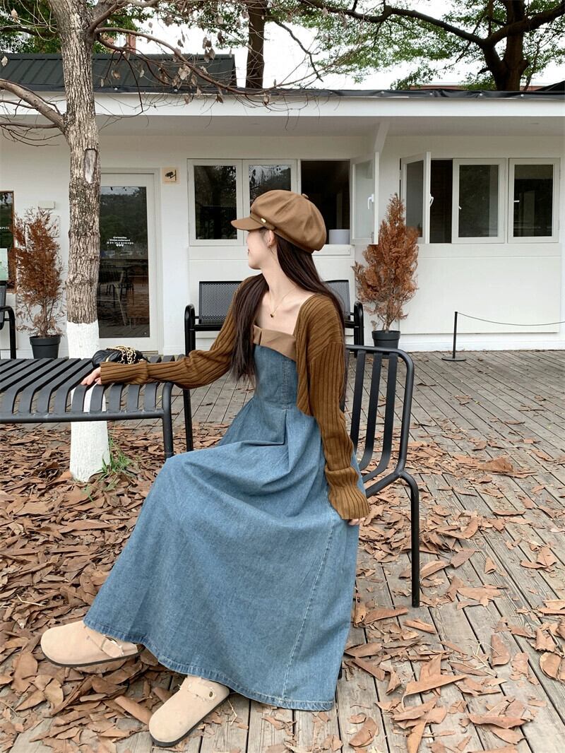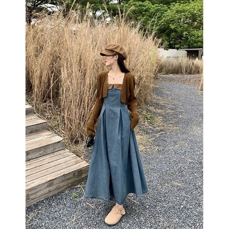 フレンチデザインの対照的なデニムサスペンダードレス長袖ニットカーディガン女性2023秋の新しいツーピースセット ロング オータム 秋物 missk92007003354