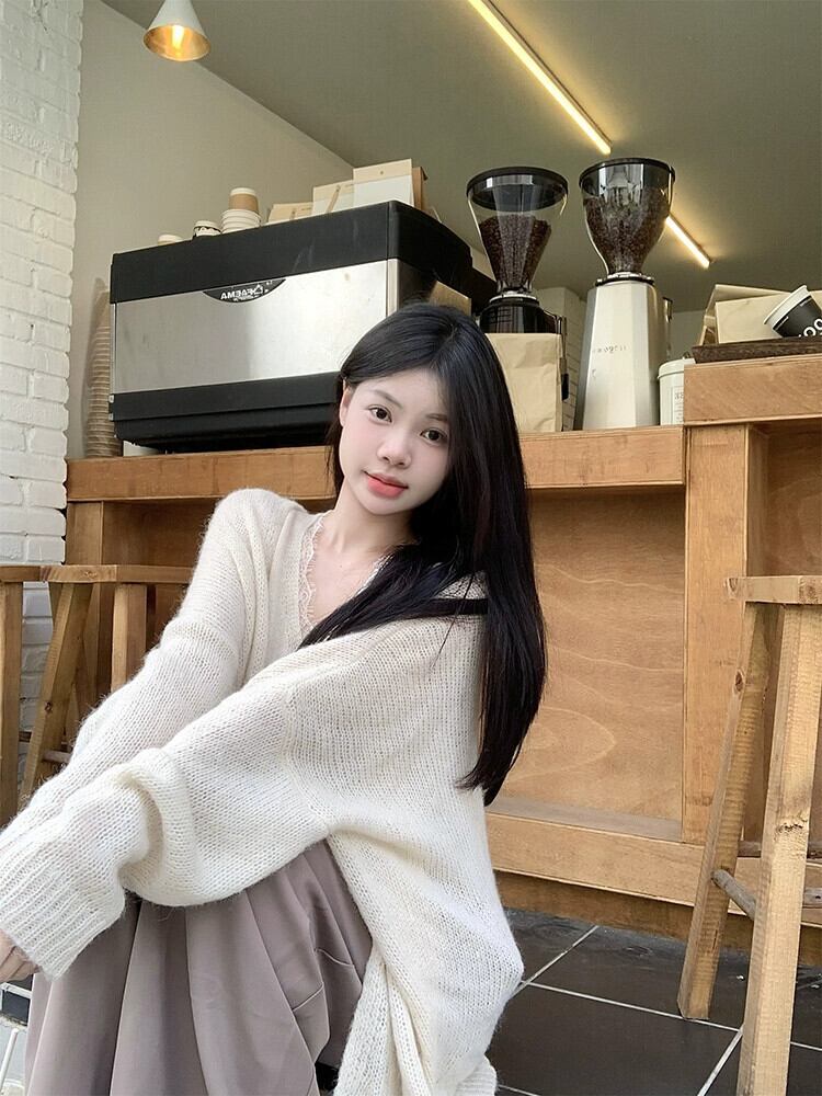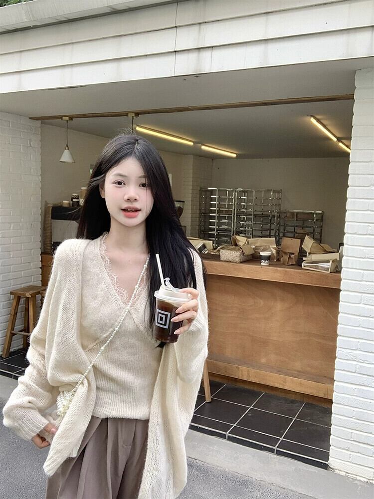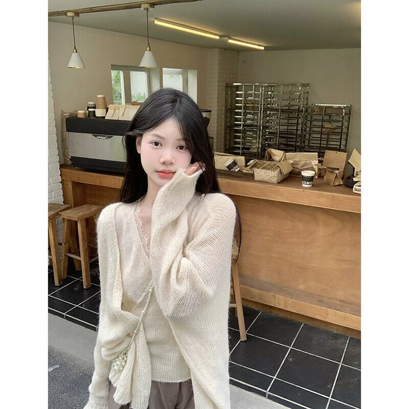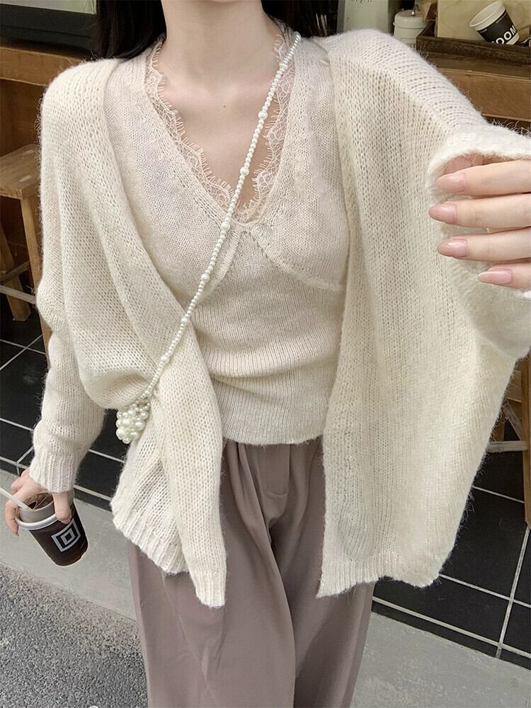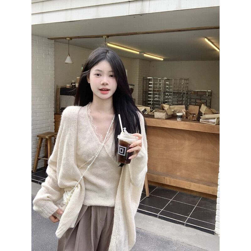優しいスタイルのレースエッジ V ネックニットベスト長袖セーターカーディガン女性秋 2023 新しいファッションツーピースセット ロング オータム 秋物 Vネック missk36791105891