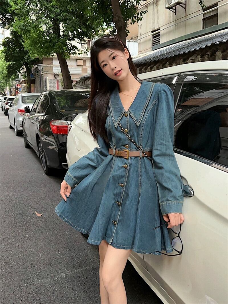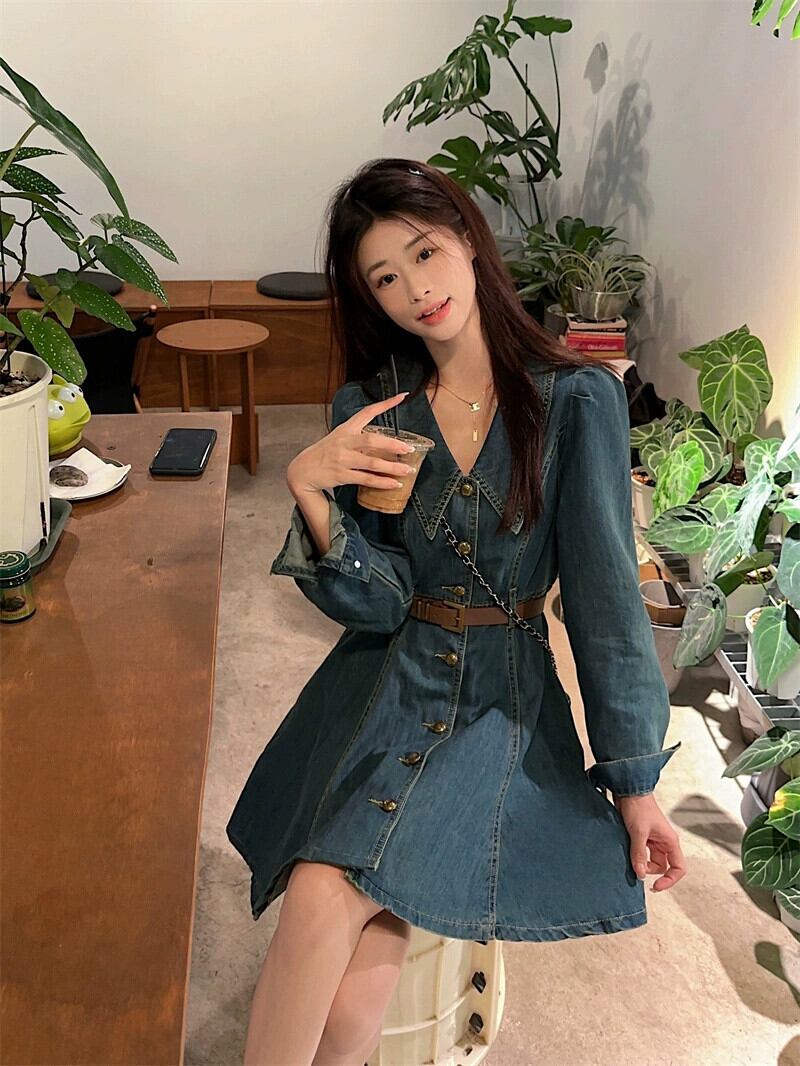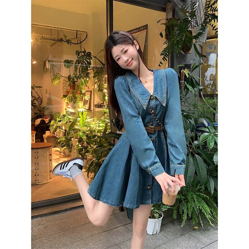 デニムドレスレディース 2023 秋の新フレンチレトロラペルウエスト痩身長袖プリーツ A ラインスカート ロング オータム 秋物 Aライン missk91634076878