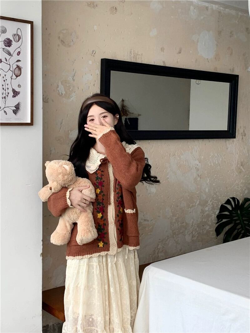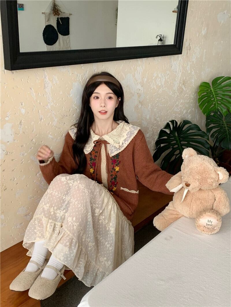 甘い ese 人形の襟のレースのドレス刺繍レースのセータージャケット女性秋 2023 新しい 2 点セット レッド 大人ガーリー スウィート キュート カジュアル オータム 秋物 missk85346800540