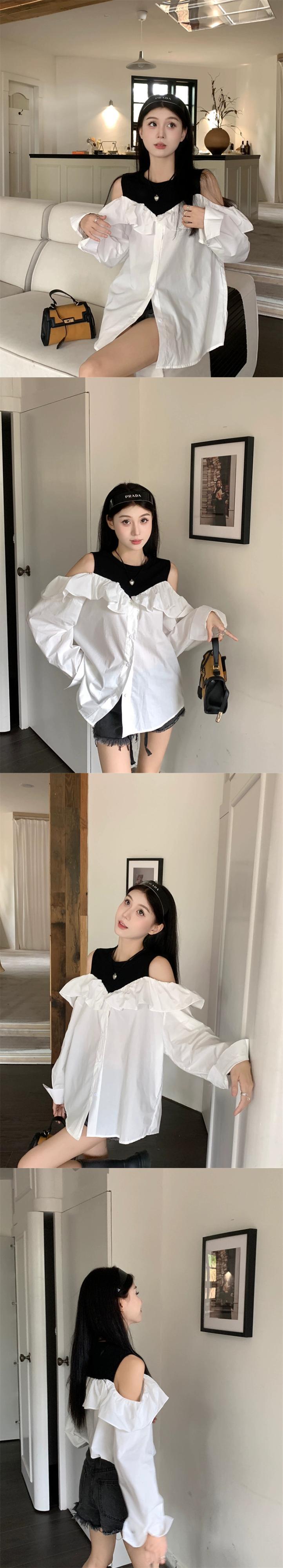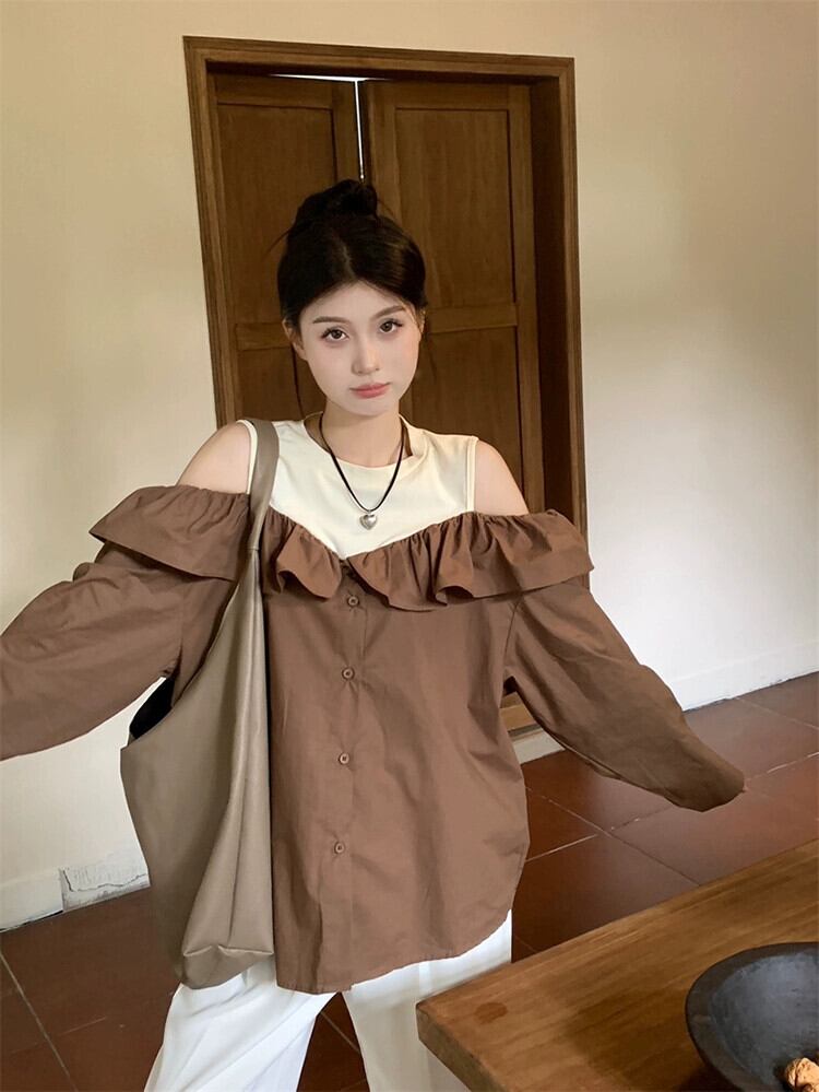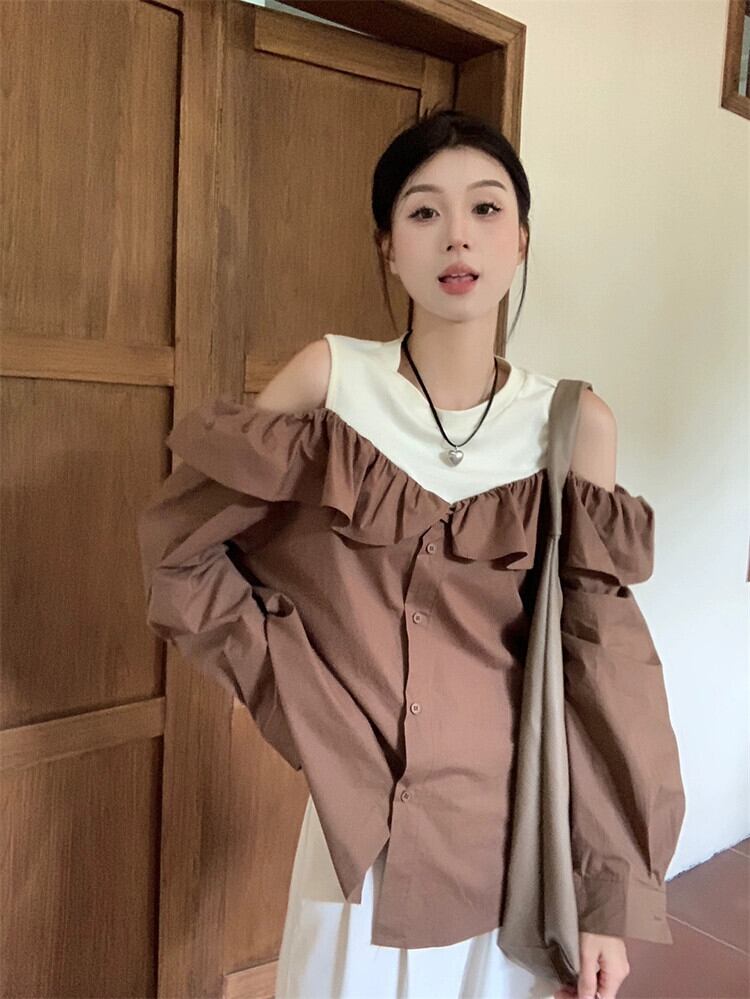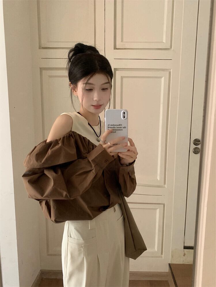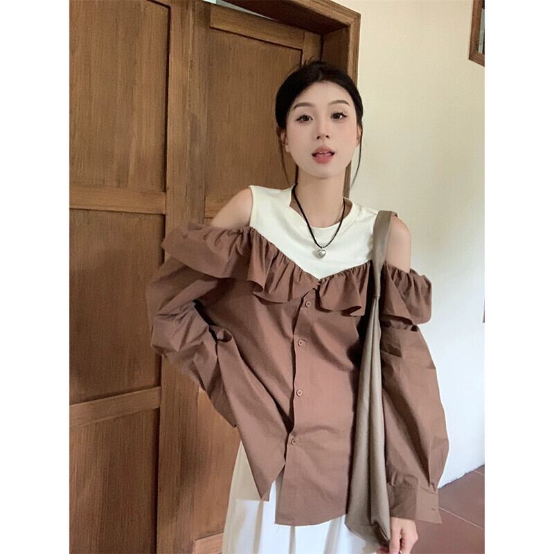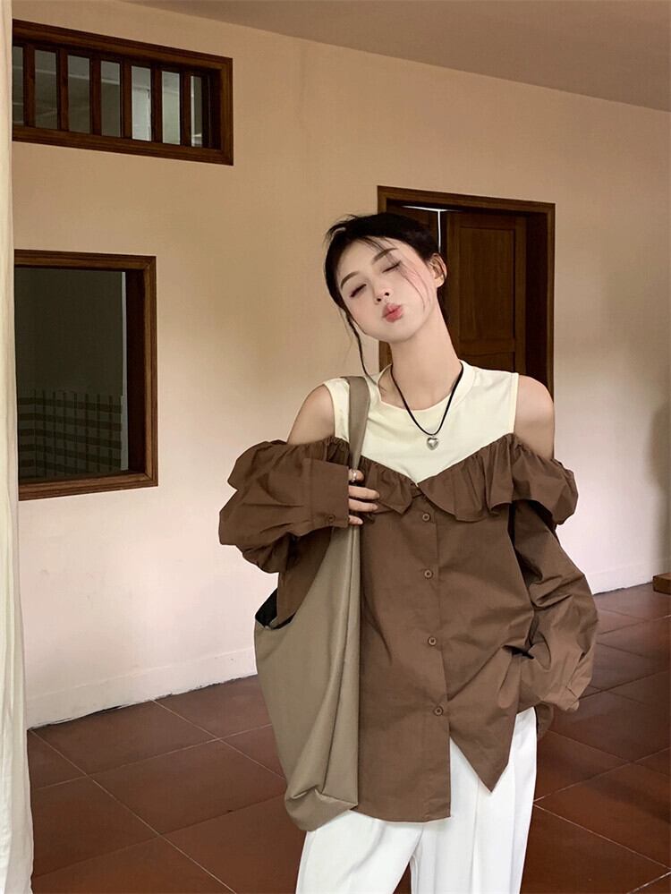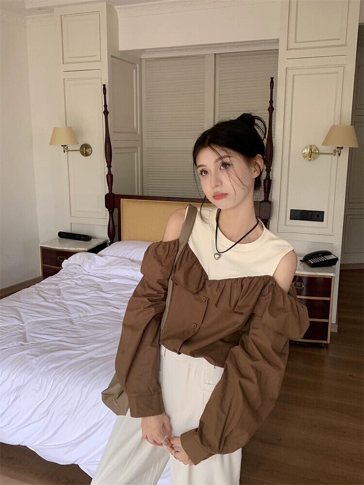 偽ツーピーススプライシング長袖シャツ女性の秋バージョン2023新しいオフショルダーデザインのゆったりとしたシックなシャツ ロング オータム 秋物 missk97410406778