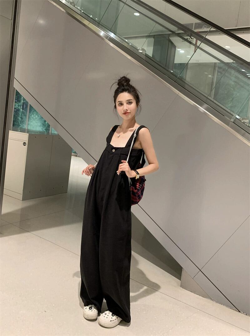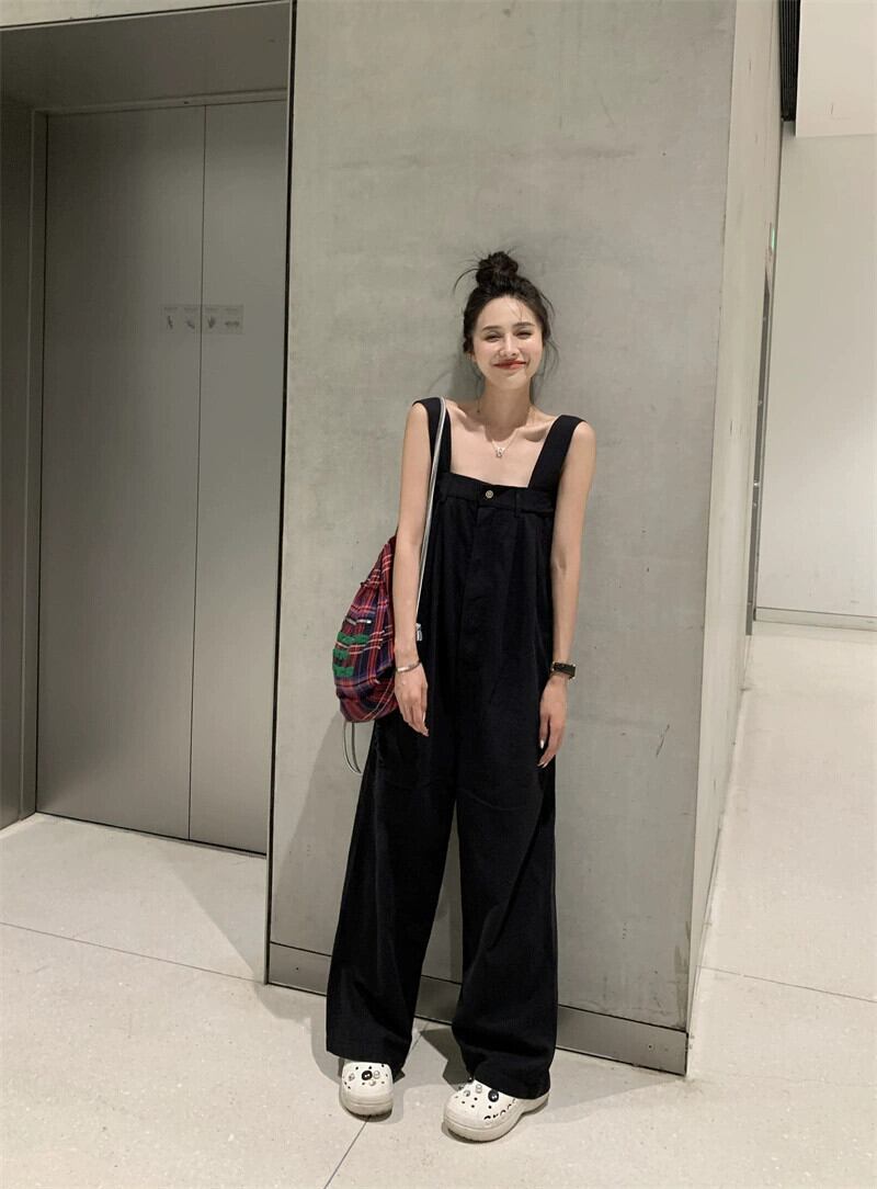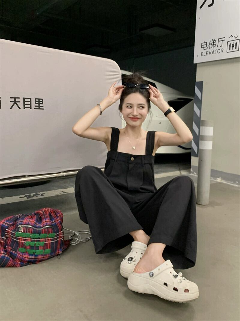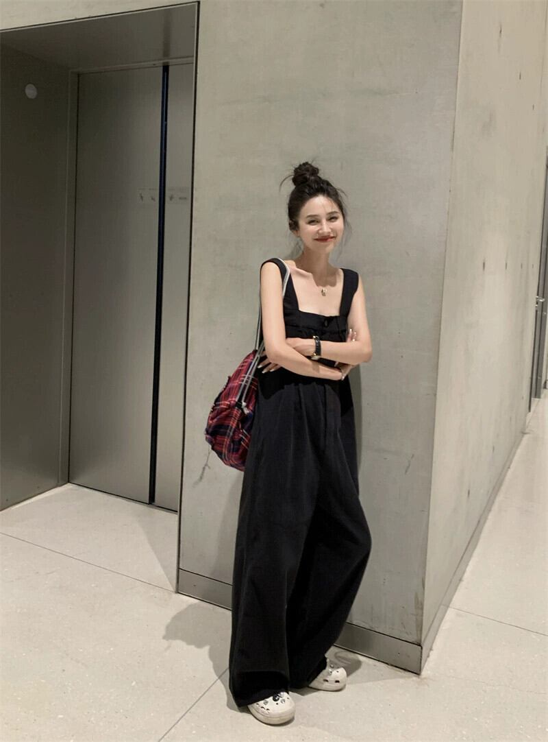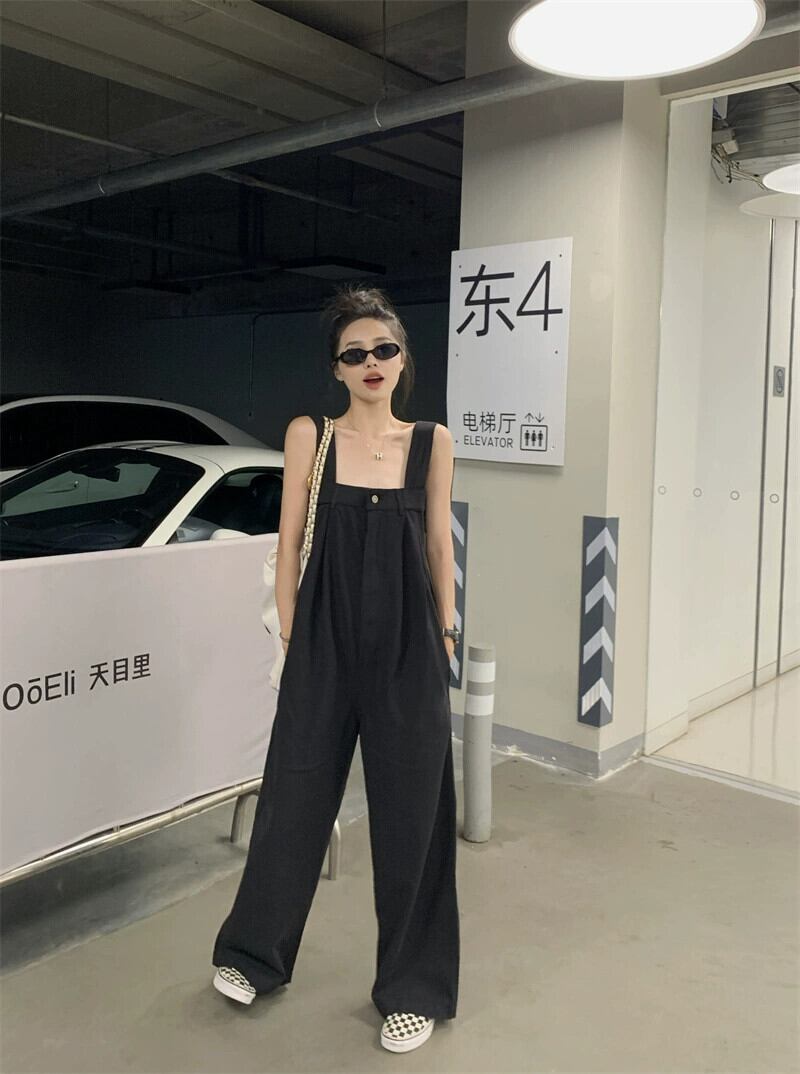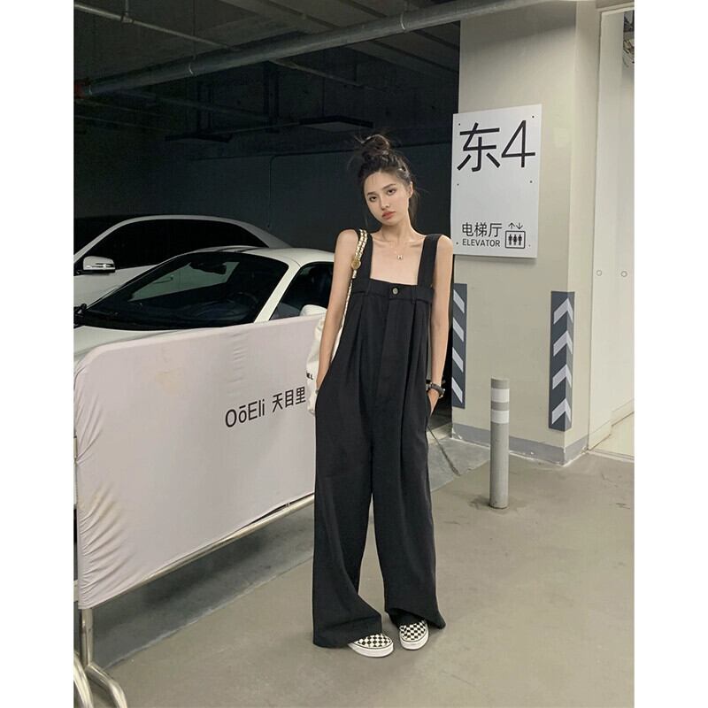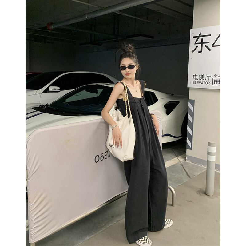 黒の床までの長さのサスペンダーパンツの女性の夏のスタイル 2023 新しい多用途ルーズで落ちるワイドレッグカジュアルジャンプスーツ ブラック サマー 夏物 missk7063680574