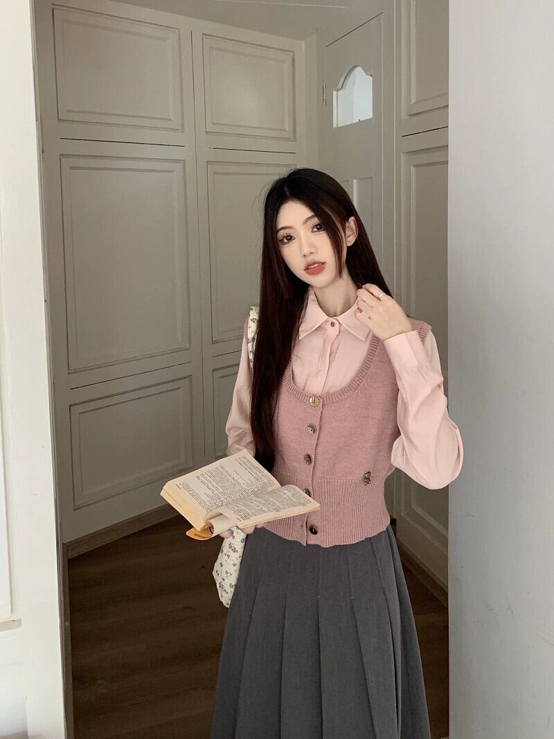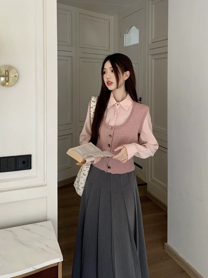 色:ピンクのシャツ,ピンクのベスト,グレースカート