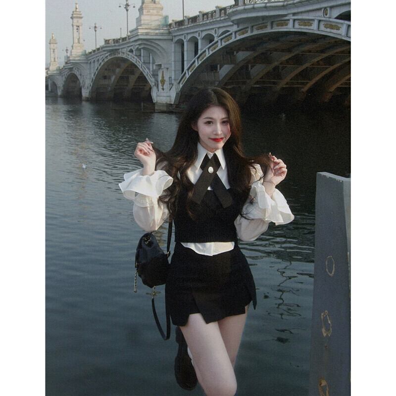 ベルスリーブシャツデザインベストハイウエストスリットヒップカバーショートスカートレディース2023秋新作ファッション3点セット ハイウェスト オータム 秋物 missk62353656092