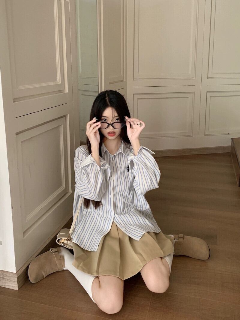 色:プリーツスカート,ストライプシャツ