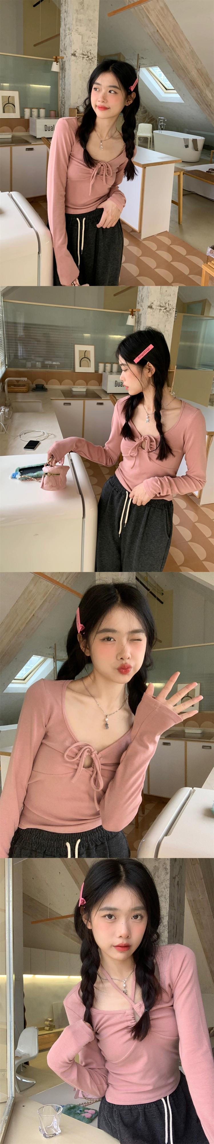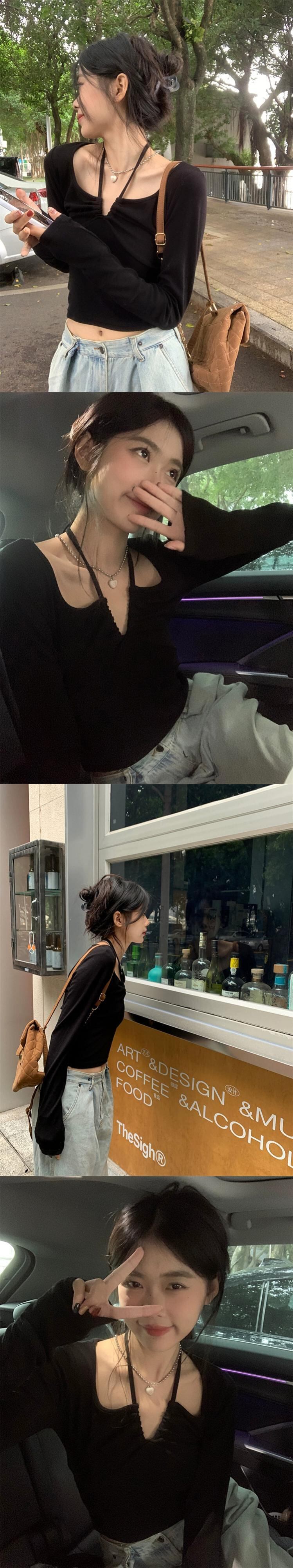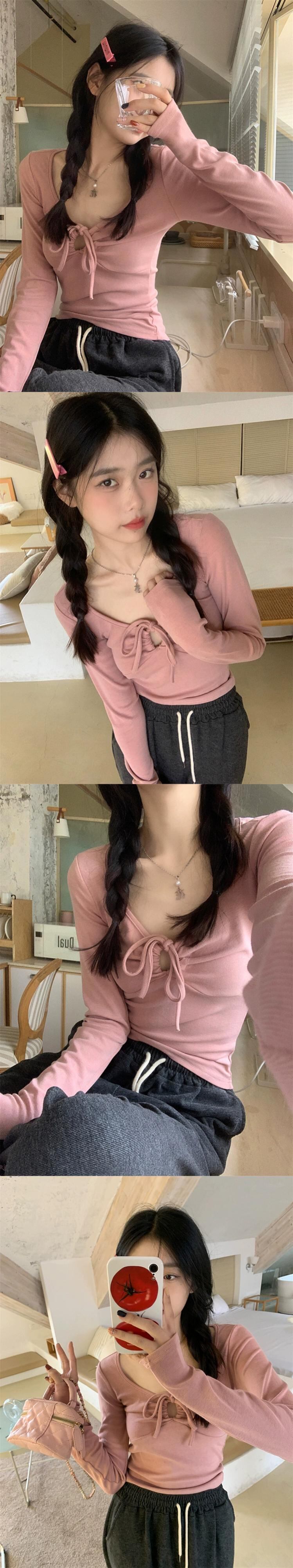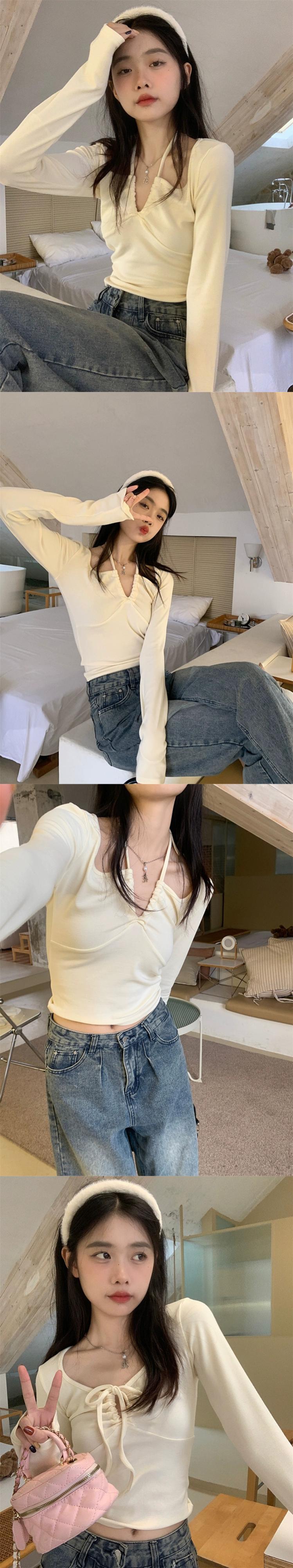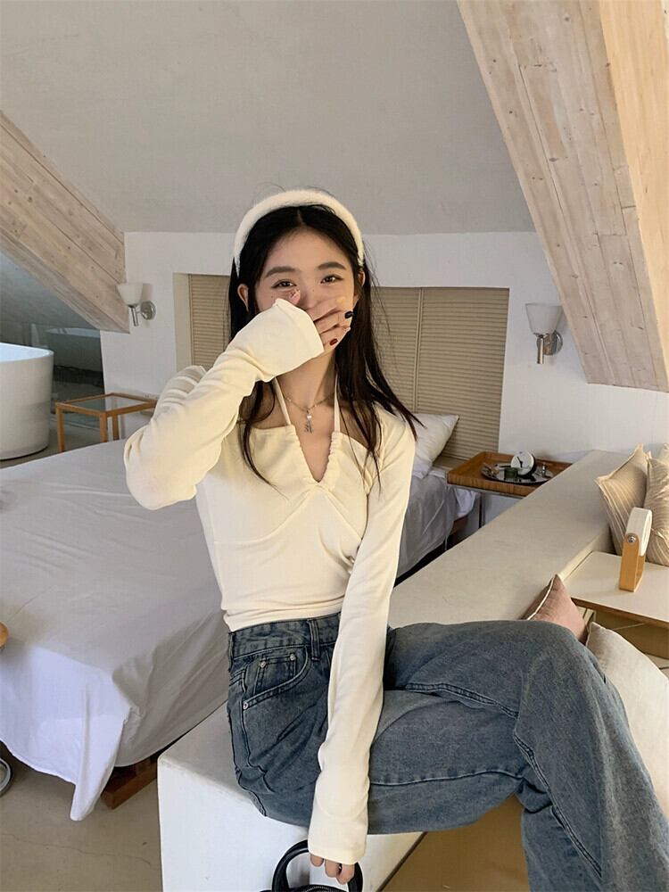純粋な欲望 V ネックストラップホルターネック長袖 Tシャツ女性秋の新デザインショートスリムフィット気質底トップトレンディ ロング オータム 秋物 Vネック missk56020370296