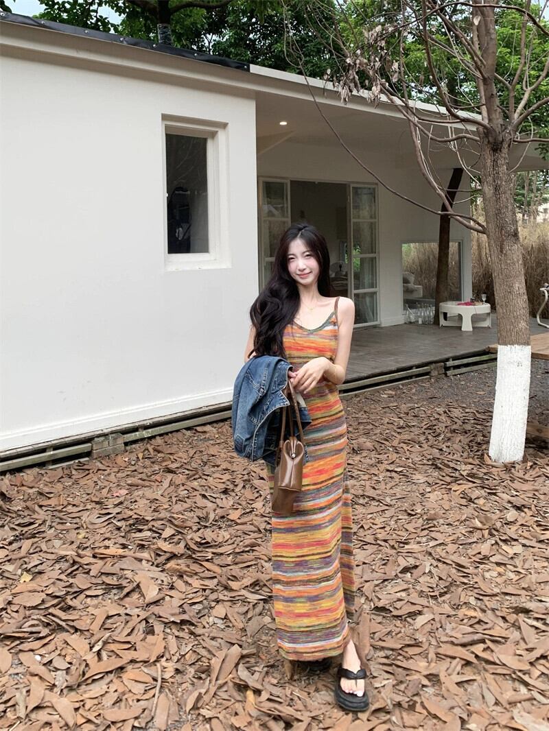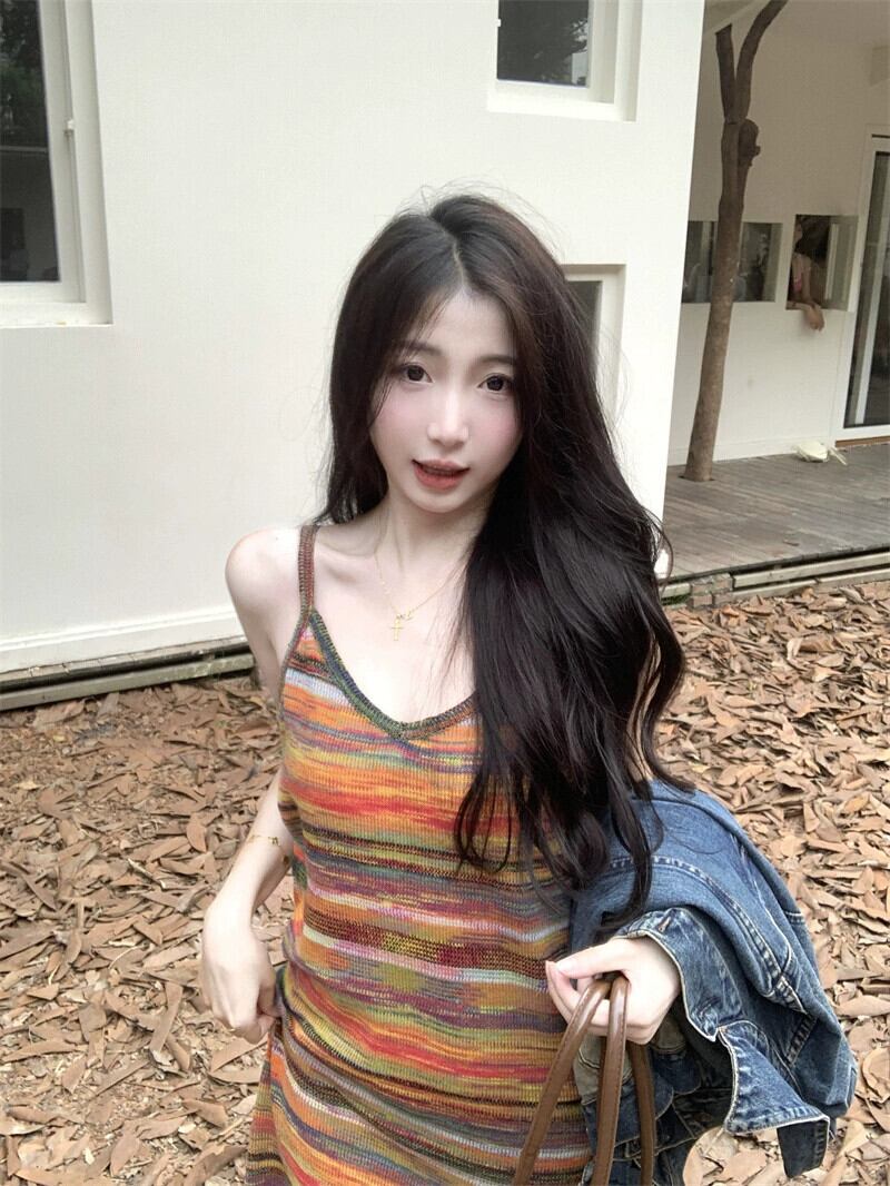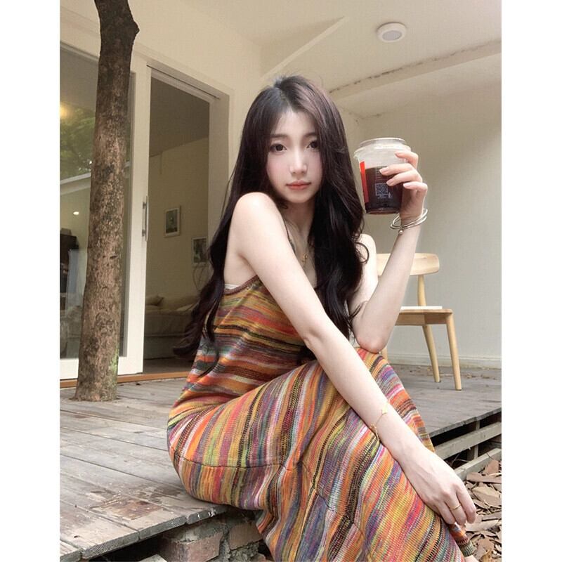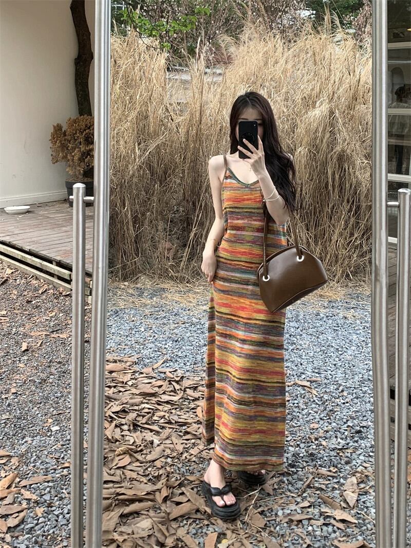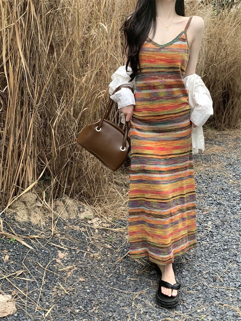 レインボーストライプサスペンダードレス秋 2023 新しいフレンチニッチルーズカジュアルボトロングスカート女性 オータム 秋物 missk63898501387
