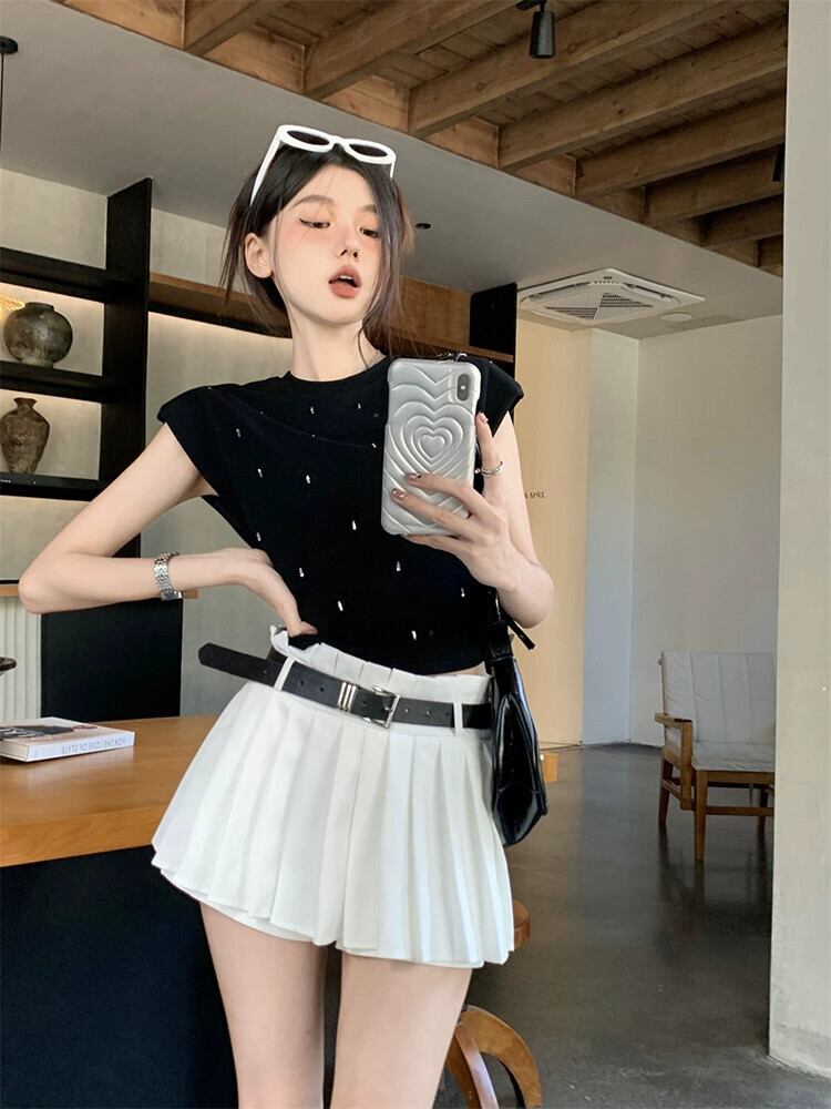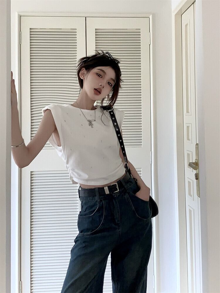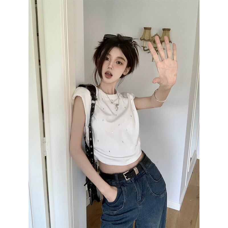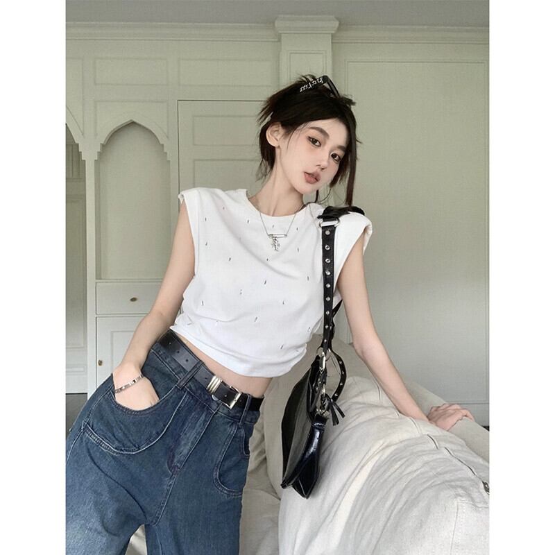 ホットダイヤモンドベスト Tシャツ女性の夏 2023 新しいレトロ香港スタイル痩身ショートノースリーブトップトレンディな サマー 夏物 missk92046876317