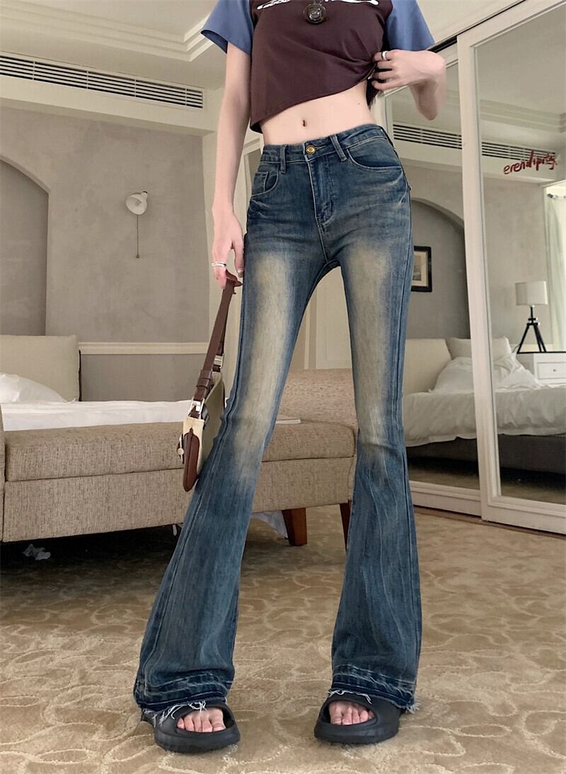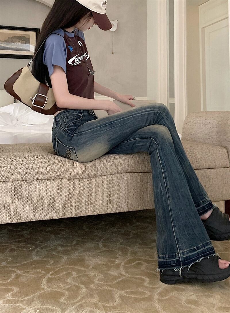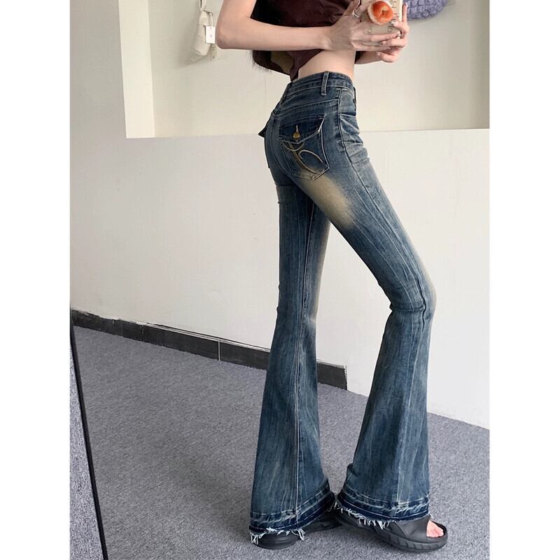 コントラストカラー洗浄マイクロブーツジーンズ女性の夏の新しいレトロネクタイスタイルハイウエスト刺繍気質ストレートロングパンツ レッド サマー 夏物 missk84468397419