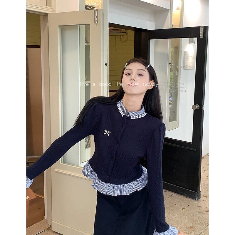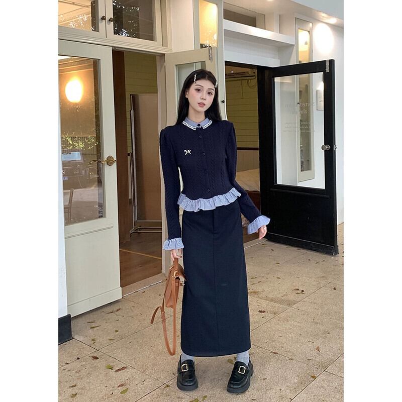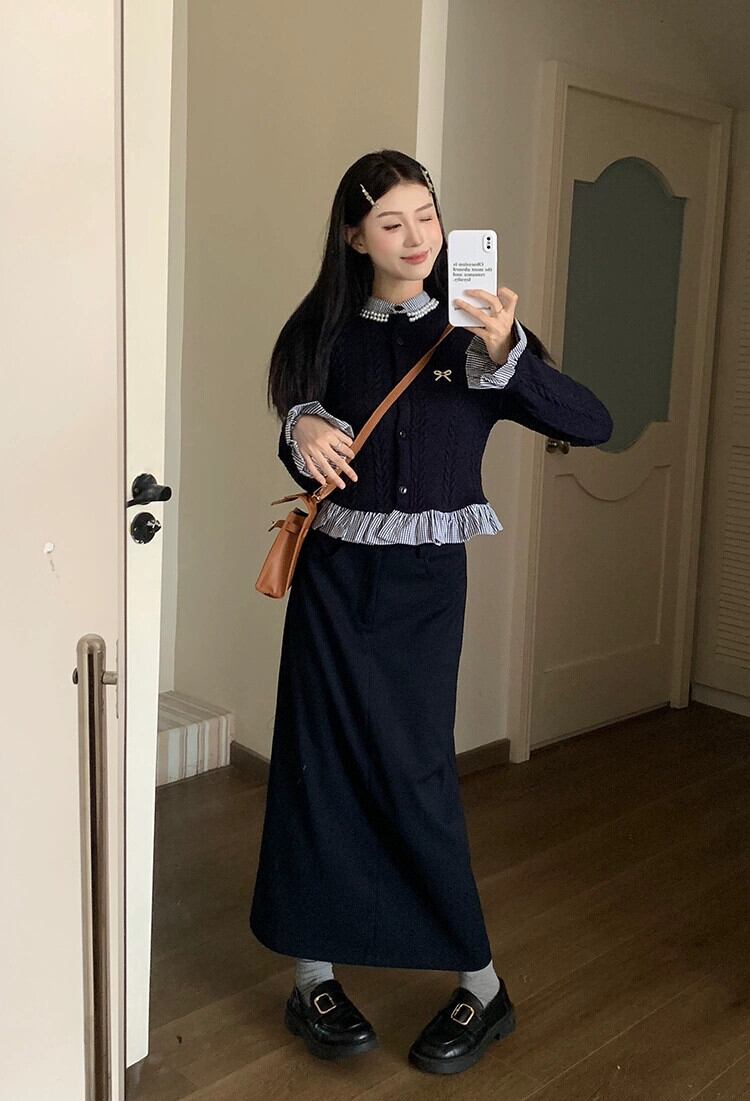 ストライプスプライシングフレンチスタイル長袖ニットカーディガンロングスカート女性秋 2023 新しいファッションスーツ オータム 秋物 missk97978125247