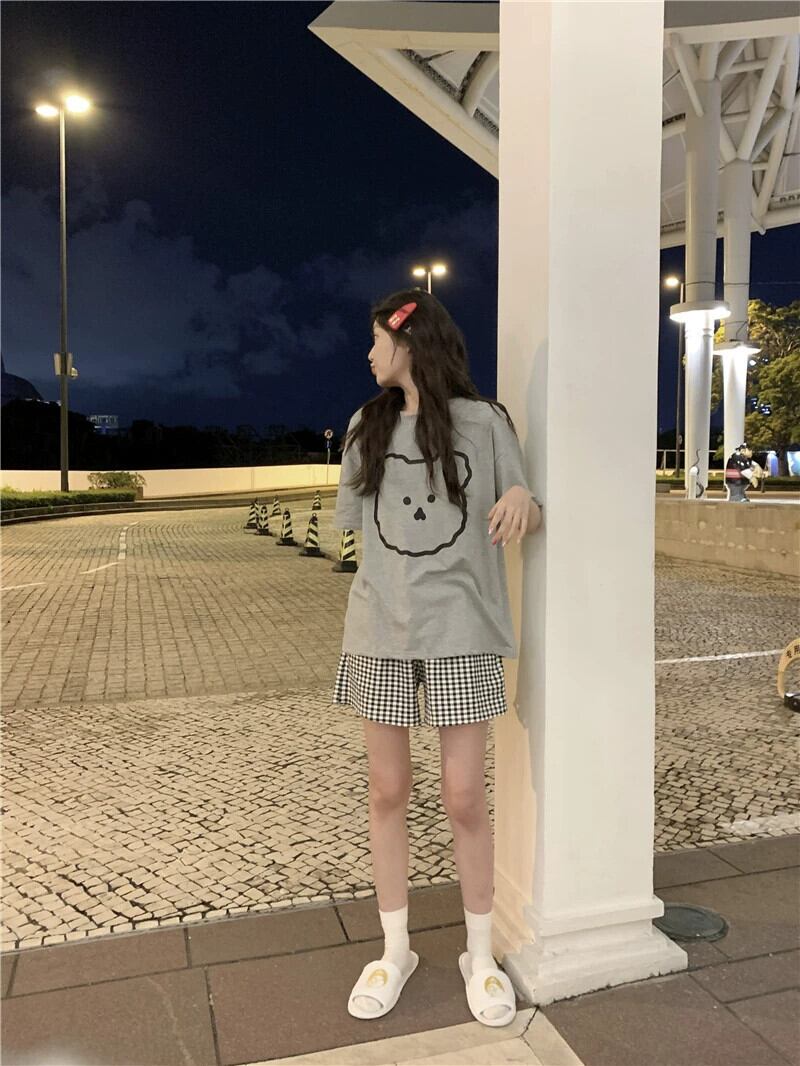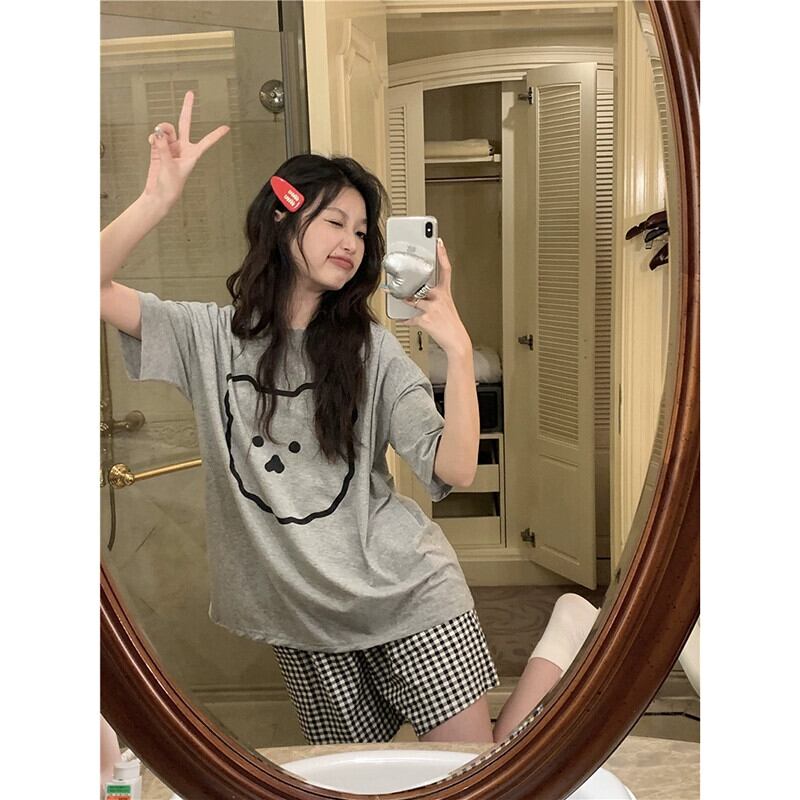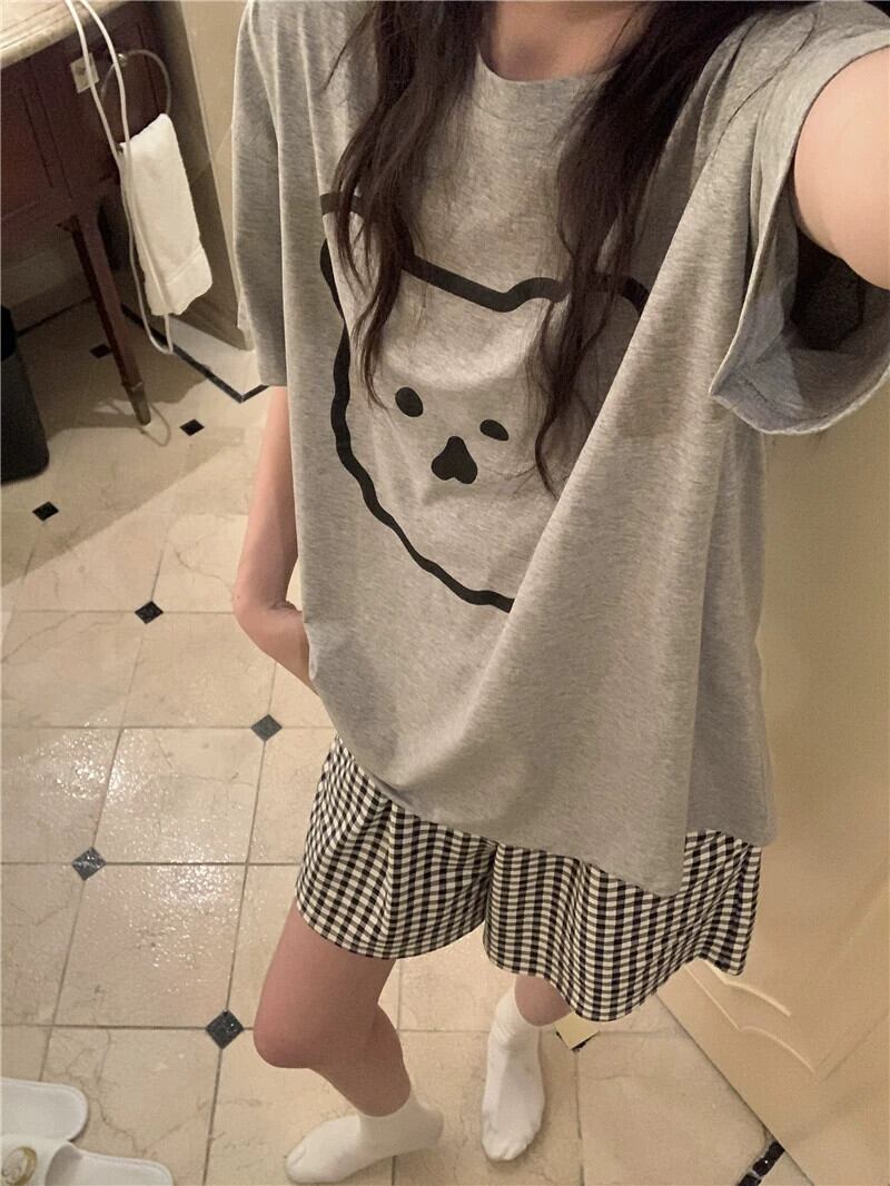 スタイルかわいいプリント半袖 Tシャツチェック柄ショートパンツパジャマ女性のホームウェアセット夏の新しい 2 点セット 大人ガーリー スウィート キュート カジュアル サマー 夏物 ショーツ ブルマー missk6083693508
