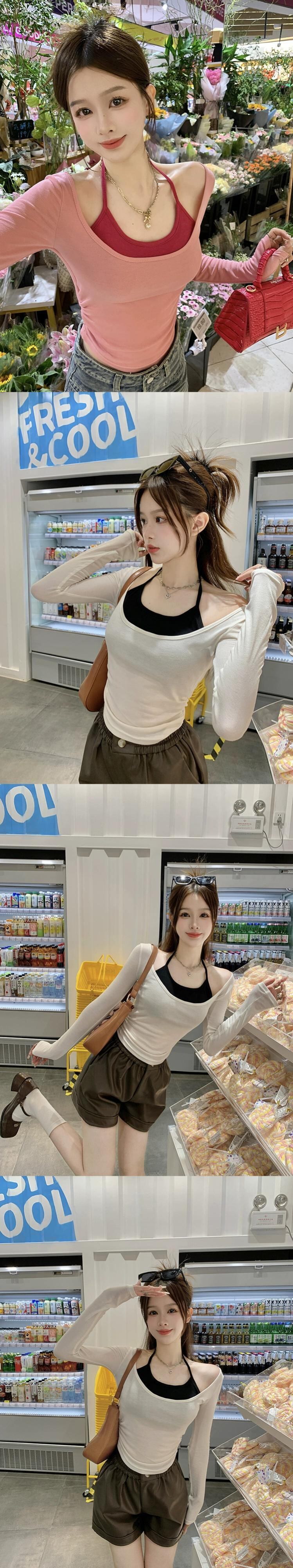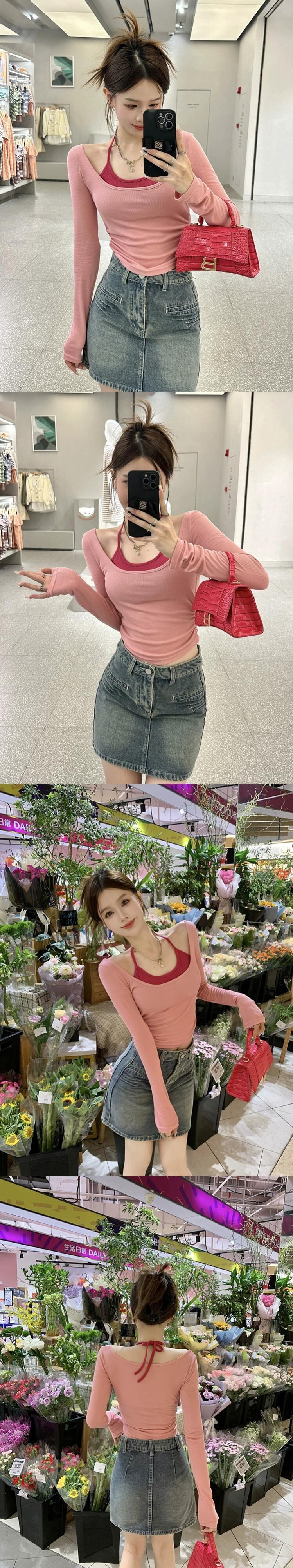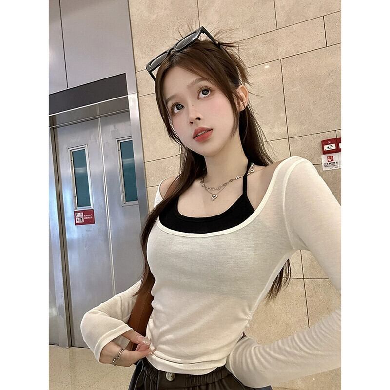 Pure Desire ホルターネック長袖 Tシャツ女性の秋バージョン 2023 フェイクツーピーススリムフィットボトリングシャツ ロング オータム 秋物 missk62559514935