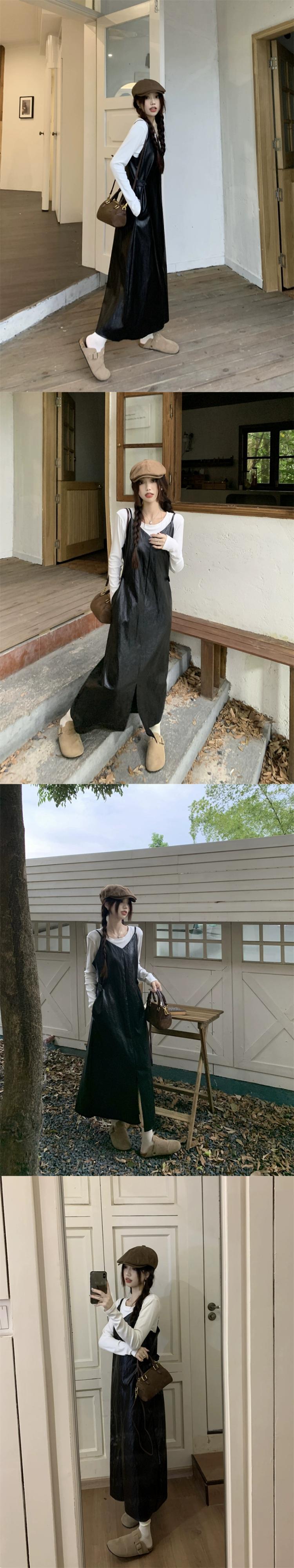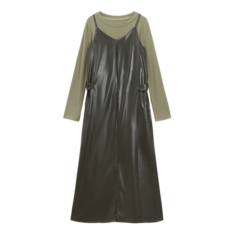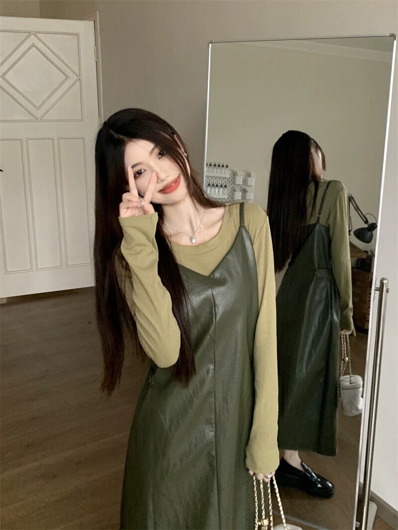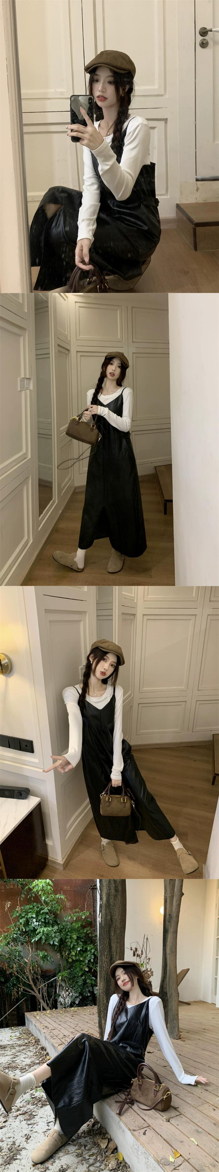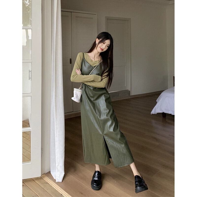 -エンド pu レザーサスペンダードレス女性秋 2023 新しいレトロウエスト痩身ミッドレングススリットスカート オータム 秋物 missk5918772204
