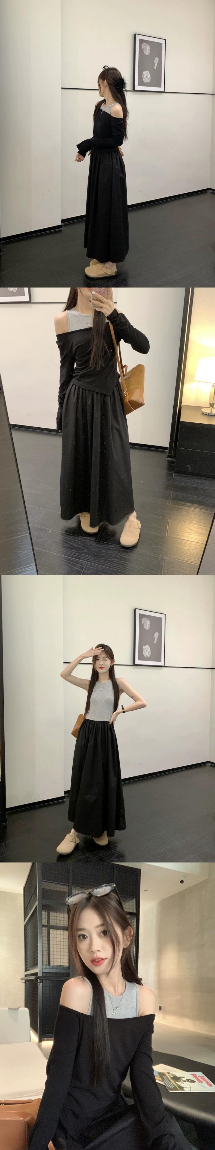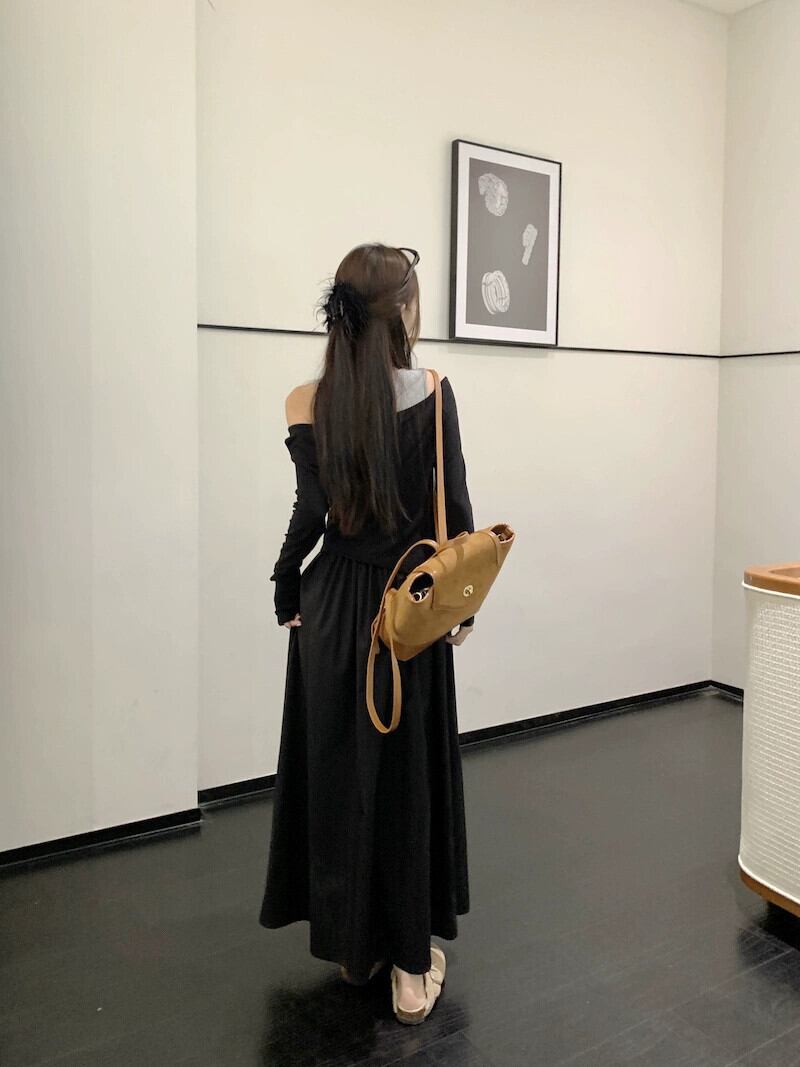 ワンショルダー長袖ドレス女性 2023 秋の新しいフレンチデザインウエスト痩身ミッドレングスリトルブラックドレス ロング オータム 秋物 missk5476000300