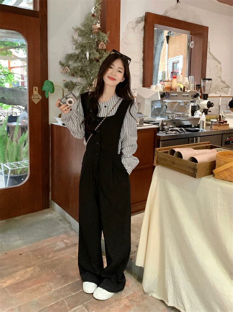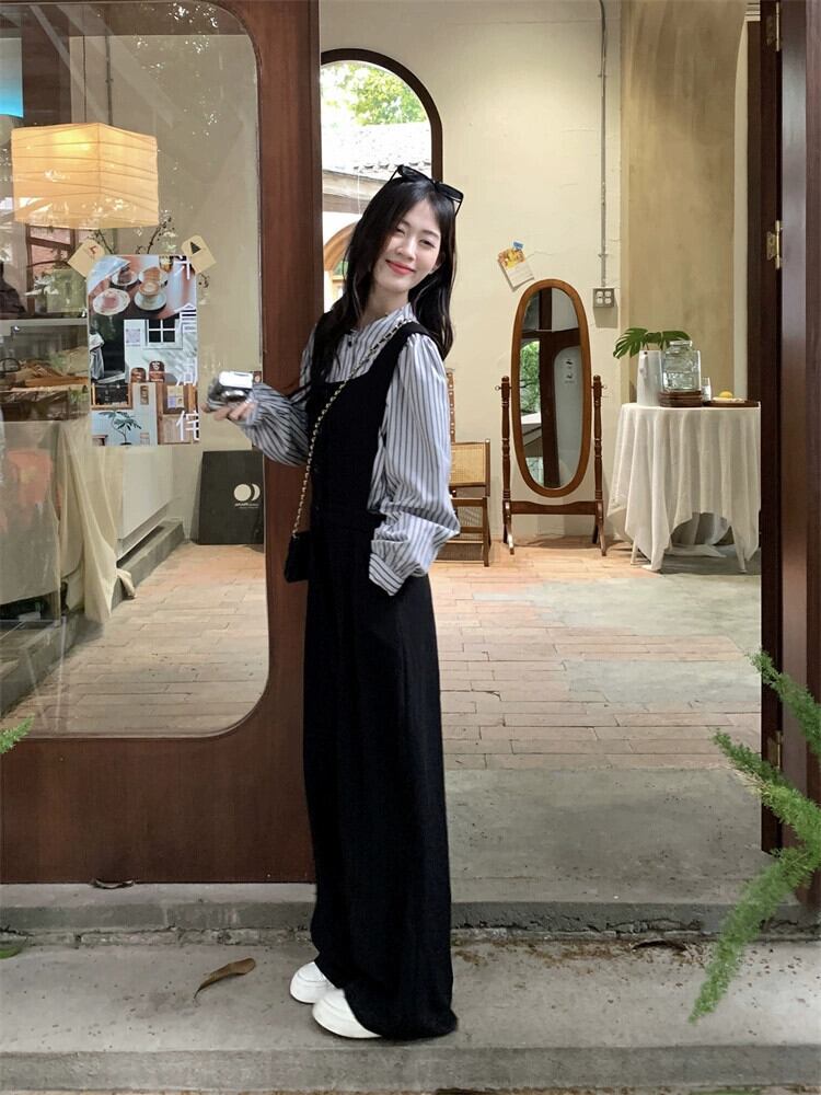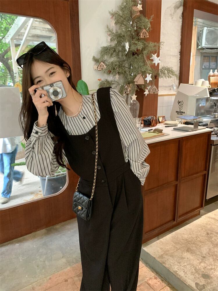 塩スタイルの衣装デザインワイドレッグサスペンダーパンツストライプ長袖シャツ女性の秋の2023新しいファッションスーツ ロング オータム 秋物 missk62524113376