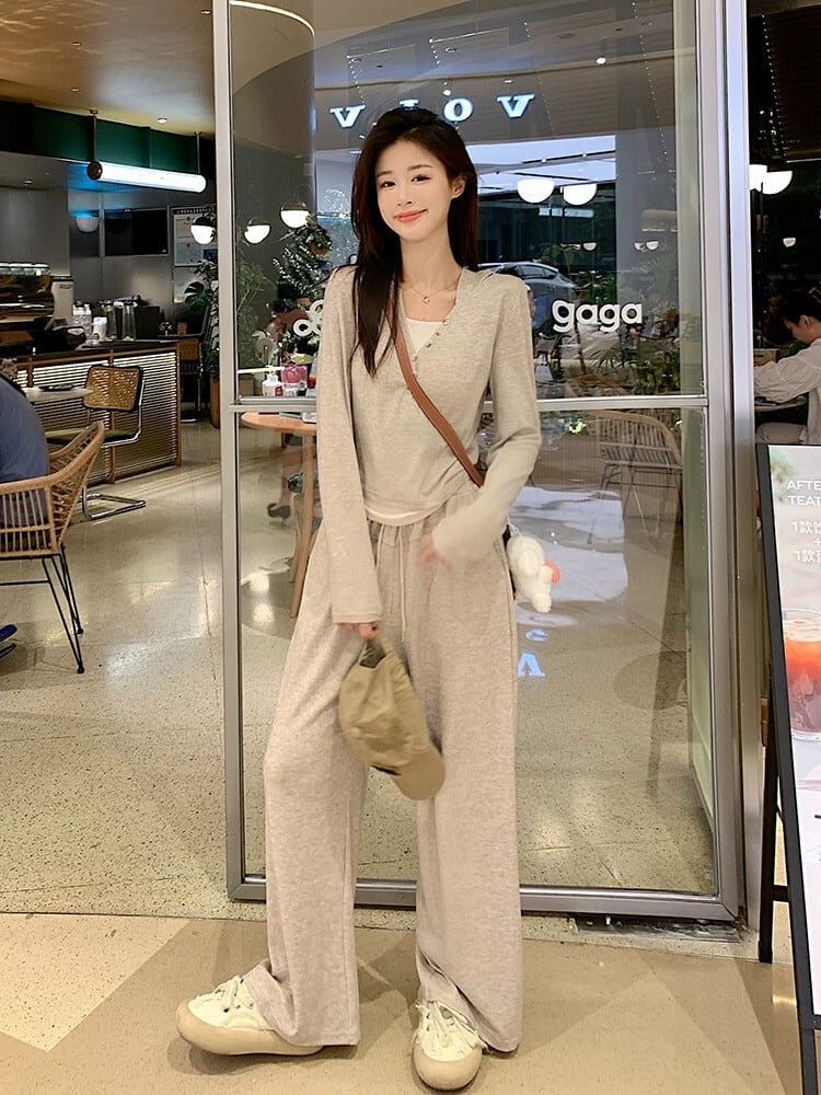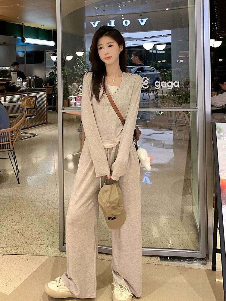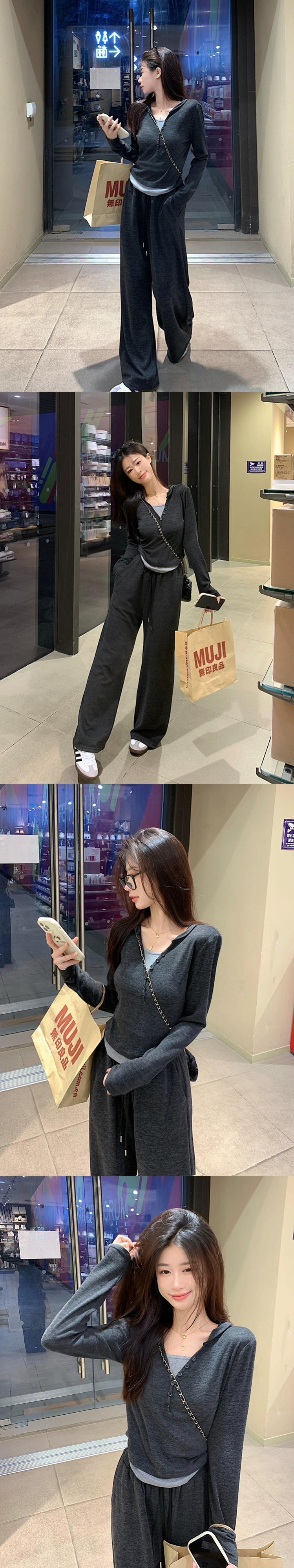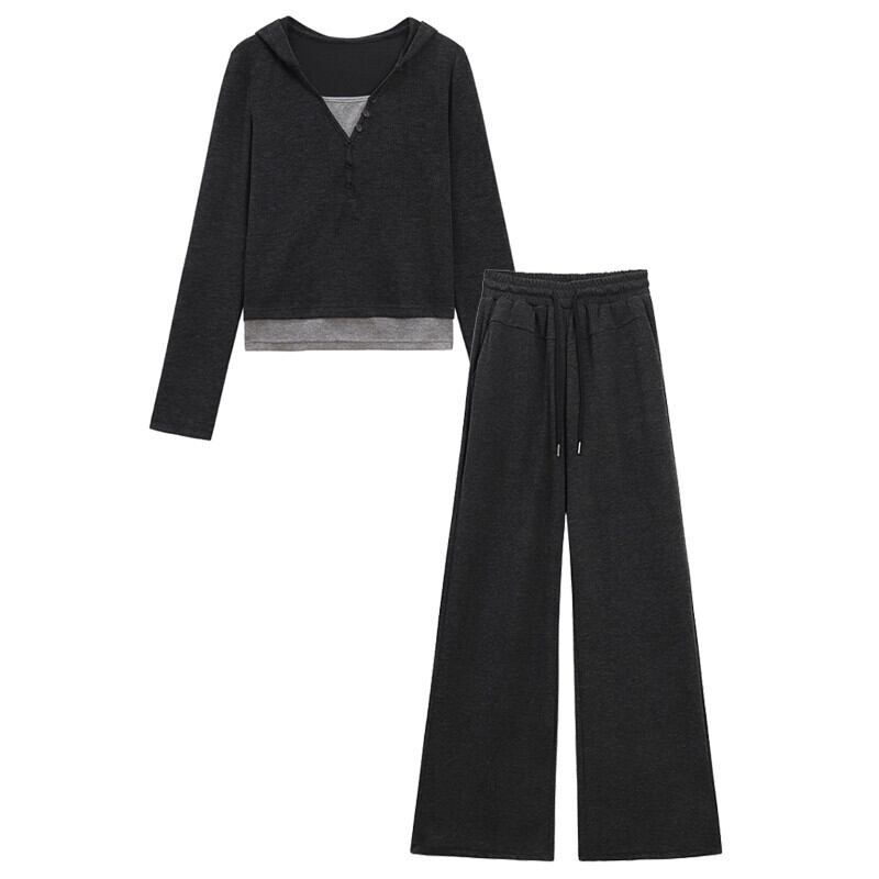 偽ツーピースステッチ塩フード付き長袖トップカジュアルワイドレッグパンツ女性秋 2023 新しいファッションスーツ ロング オータム 秋物 missk28954344675