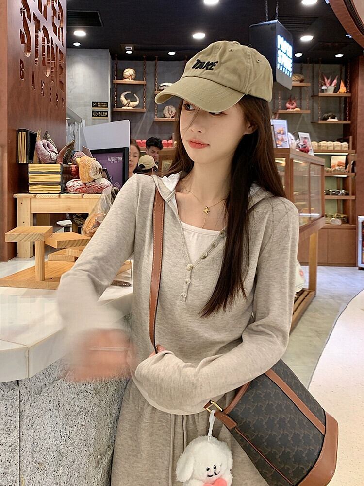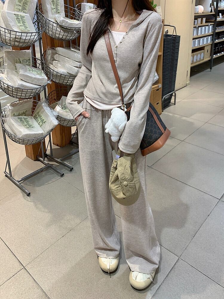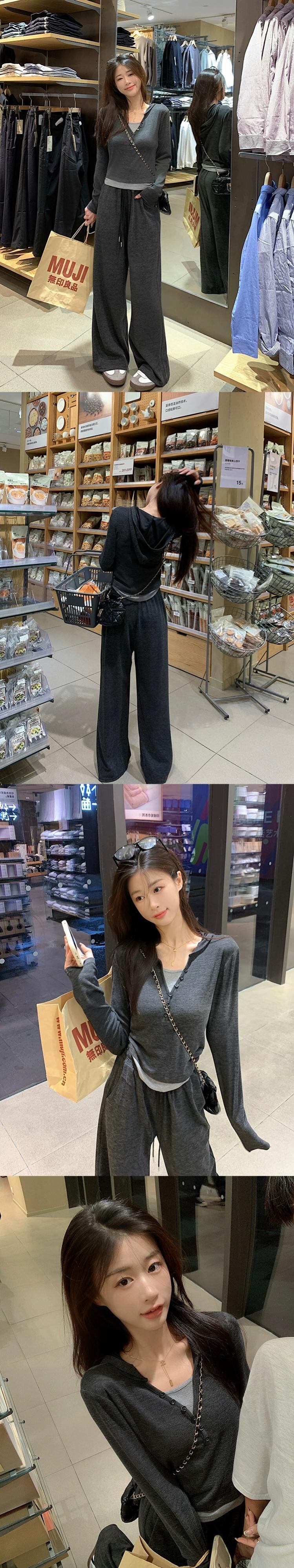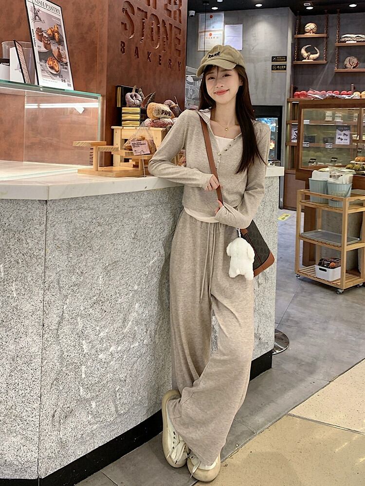 偽ツーピースステッチ塩フード付き長袖トップカジュアルワイドレッグパンツ女性秋 2023 新しいファッションスーツ ロング オータム 秋物 missk28954344675