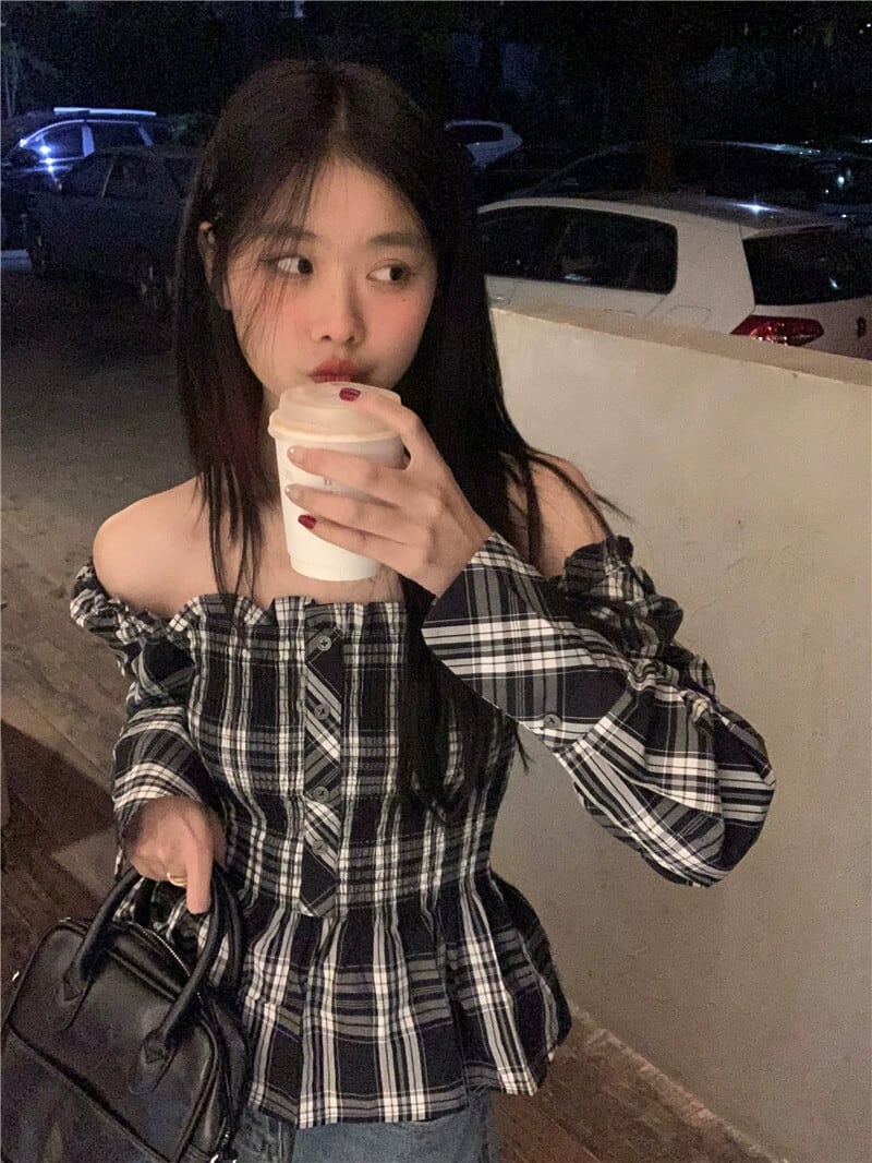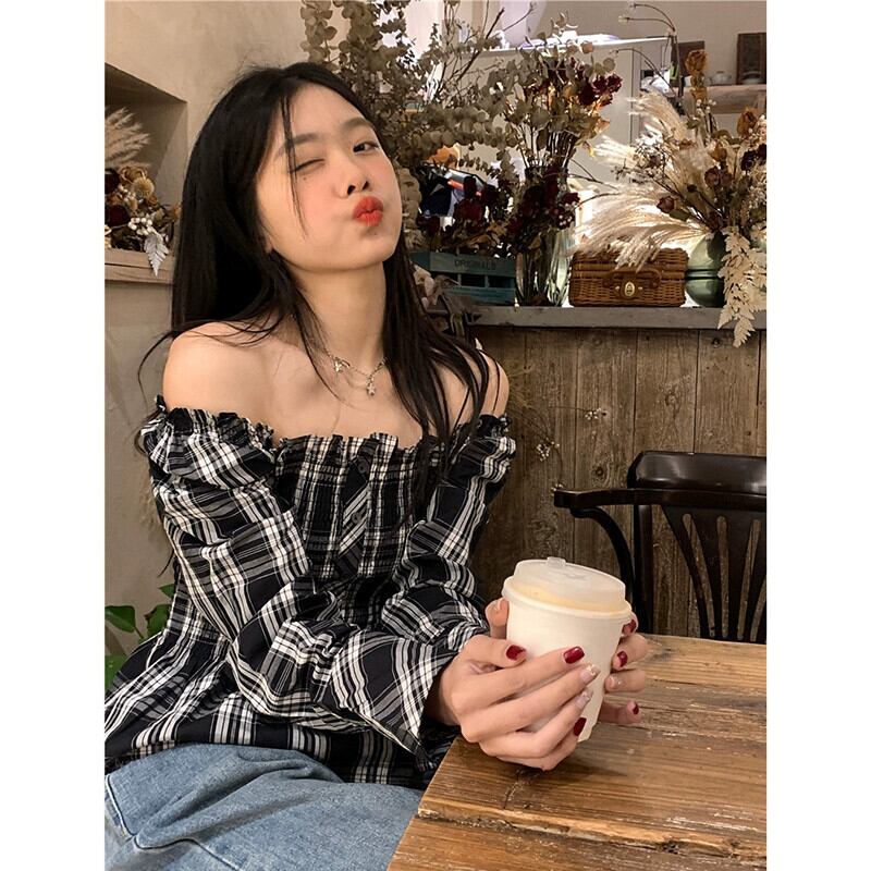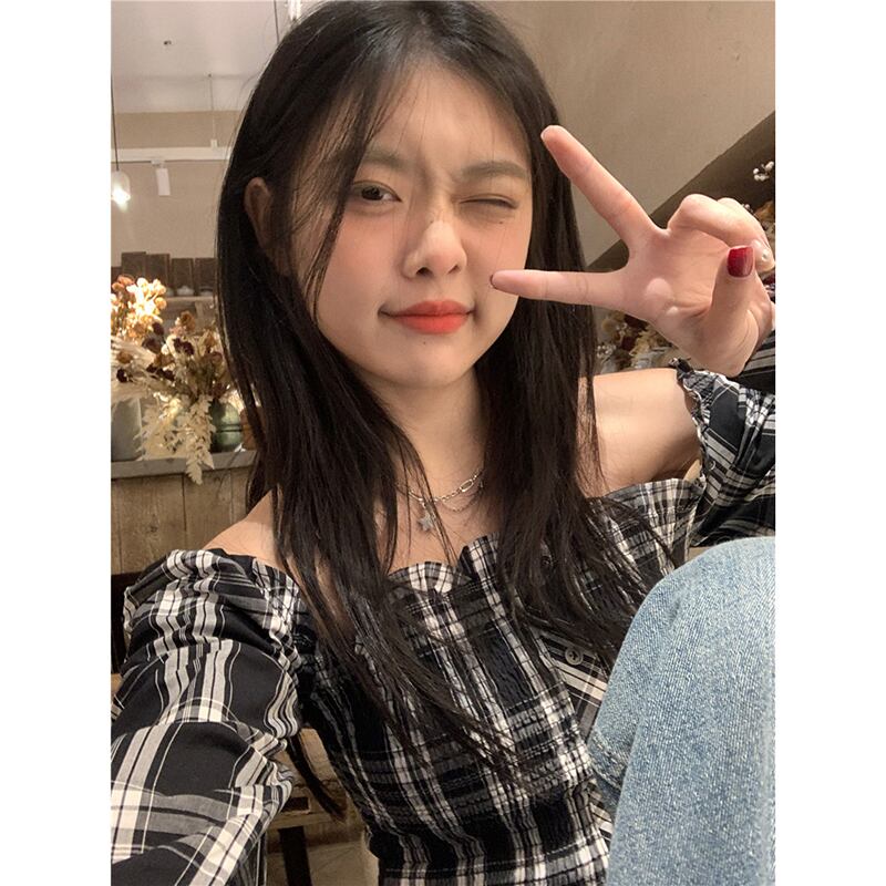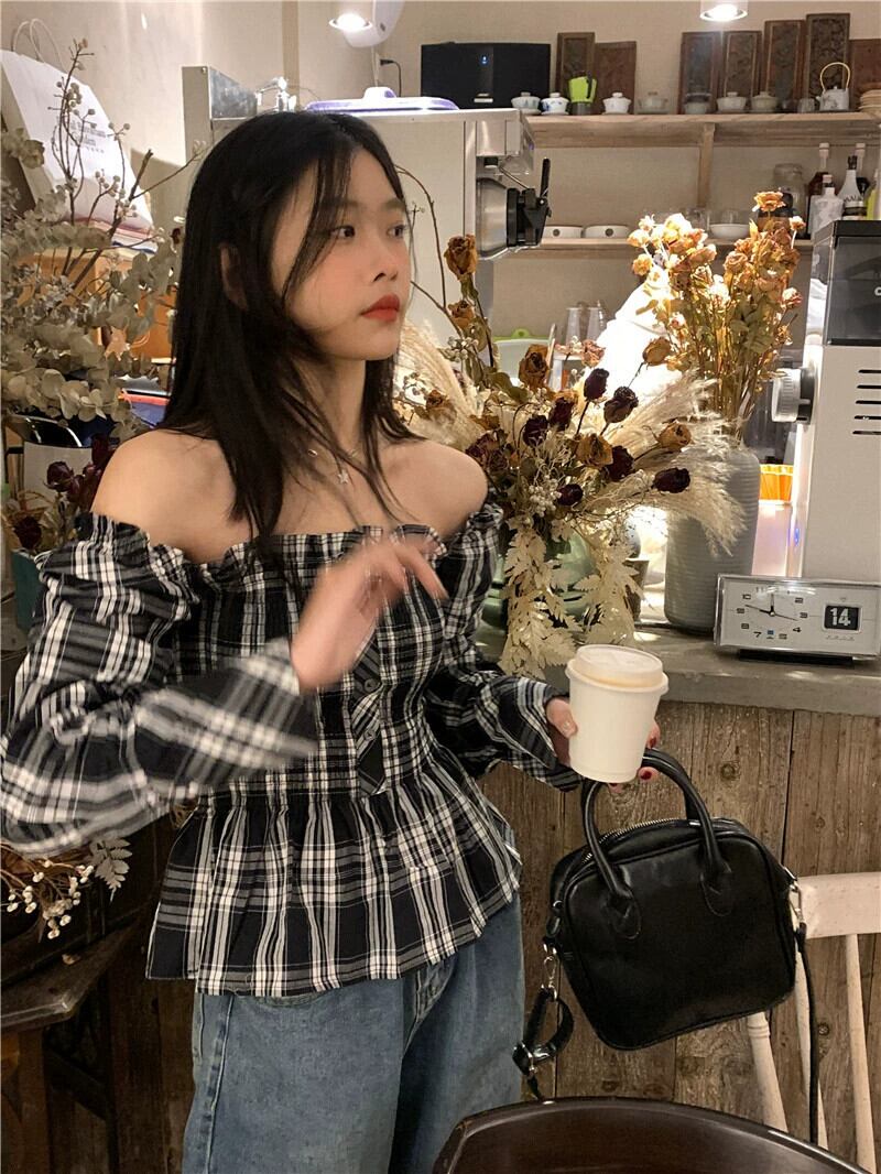 スタイルパフスリーブワンショルダーセクシーなショートシャツ夏の新しいスタイルチェック柄シャツイントップス婦人服 サマー 夏物 missk30574087188